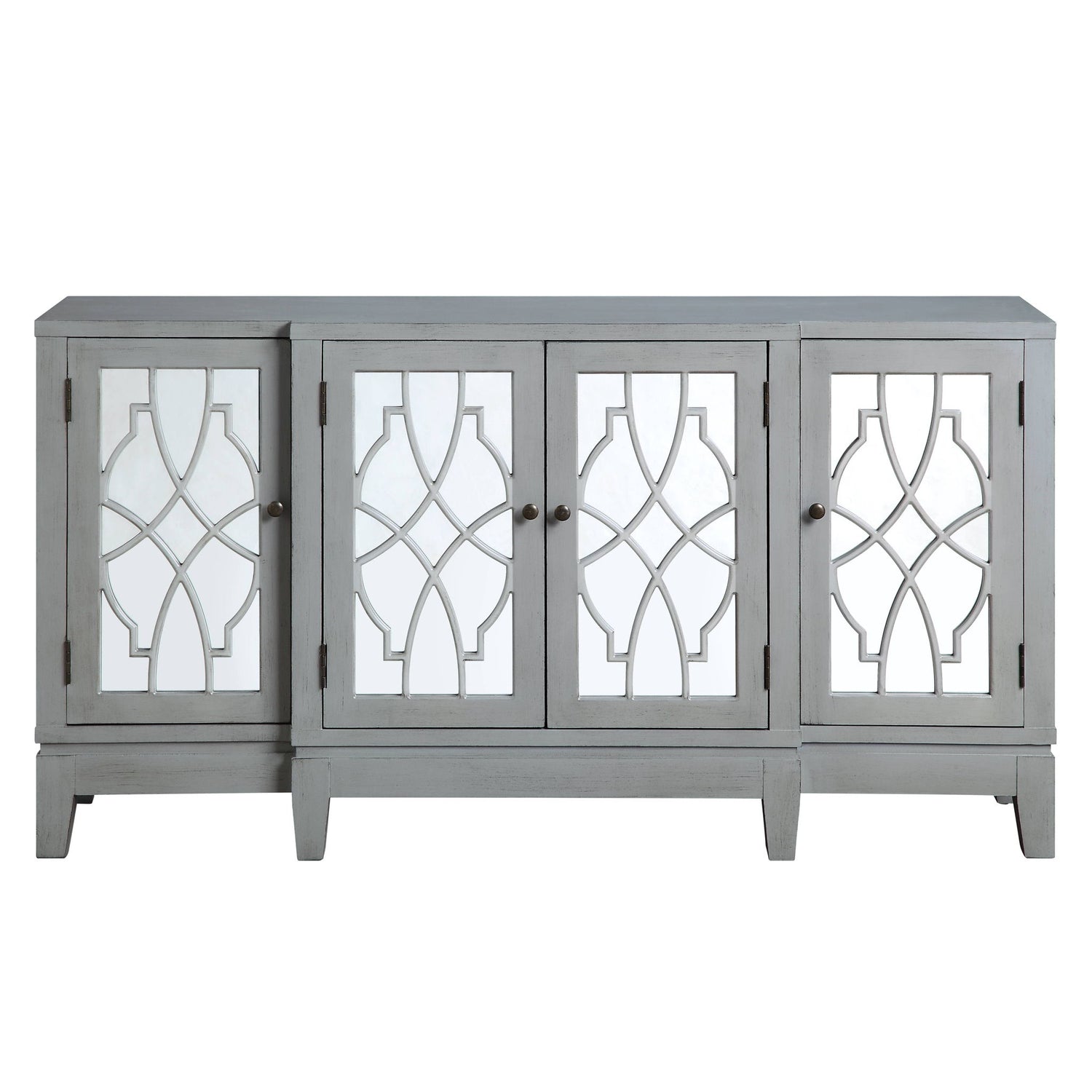 - Design Features: The Magdi Antique Gray Finish Console Cabinet boasts a stylish design with 4 mirror-front doors and patterned detailing. It stands on tapered legs, adding an elegant touch to any room.