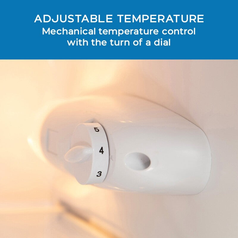 The door shelves allow you to easily store beverages, while the glass interior shelves allow you to arrange salads, fruits, snacks, and other food for easy access throughout the day. The freezer section is the perfect solution when it comes to saving money and storing bulk frozen foods. This compact fridge features manual defrost, so your food and beverages stay fresh and cold. Select the right settings for your items with the mechanical temperature control.