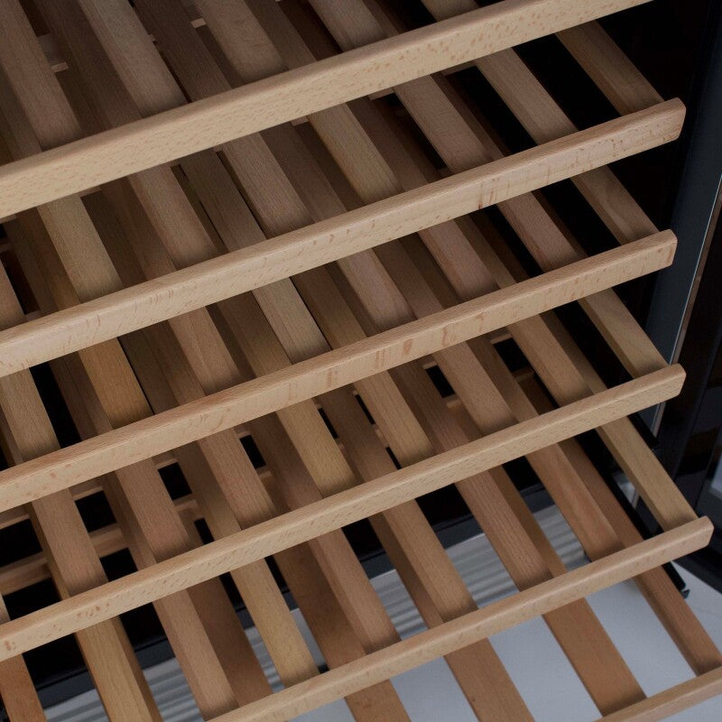 Easily view your wine choices through the glass door and simply pull out the wooden shelves to select the bottle of your choosing. This wine cooler features automatic defrost, so your wine stays perfectly chilled. Select the correct settings at the touch of a button and monitor the temperature ((degree)C/(degree)F) for red, white or sparkling wines with the temperature monitor display. It has a built-in fan with a charcoal filter to maintain an even temperature and help absorb odors.