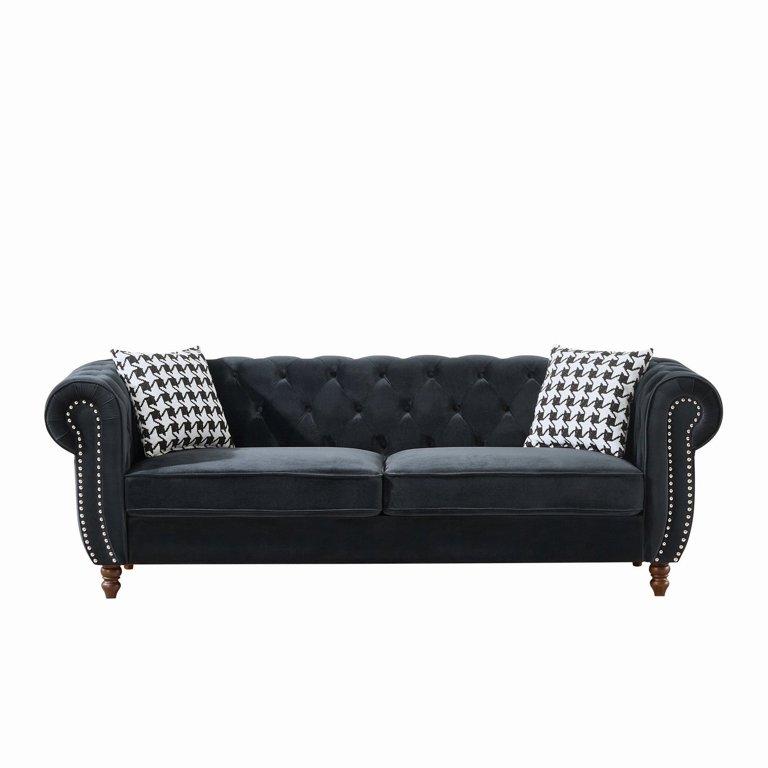 Chesterfield Velvet Upholstery Fabric Sofa With Roll Armrest & Nailhead, Mid Century Modern Couch - Black