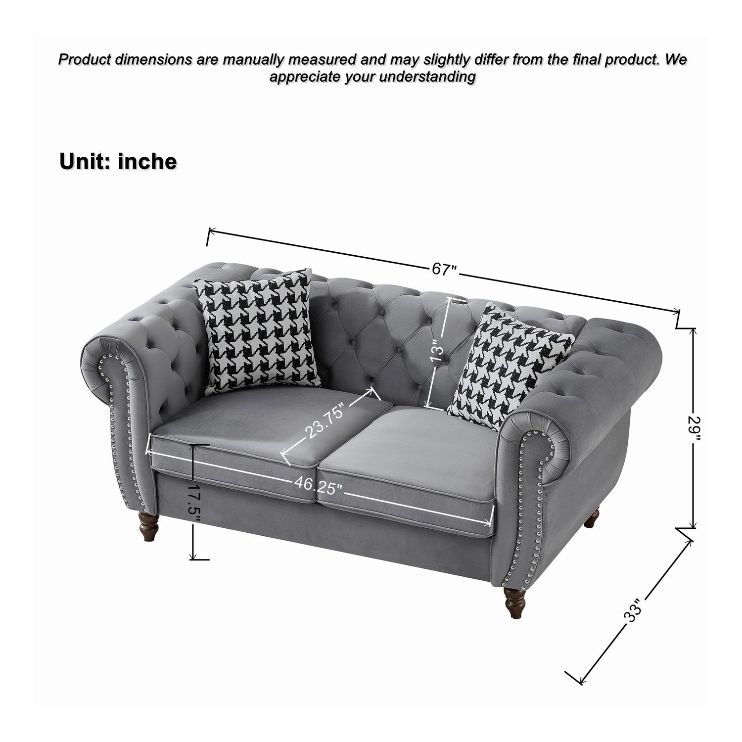 Chesterfield Velvet Upholstery Fabric Sofa With Roll Armrest And Nailhead, Mid Century Modern 2 Seater Couch - Gray