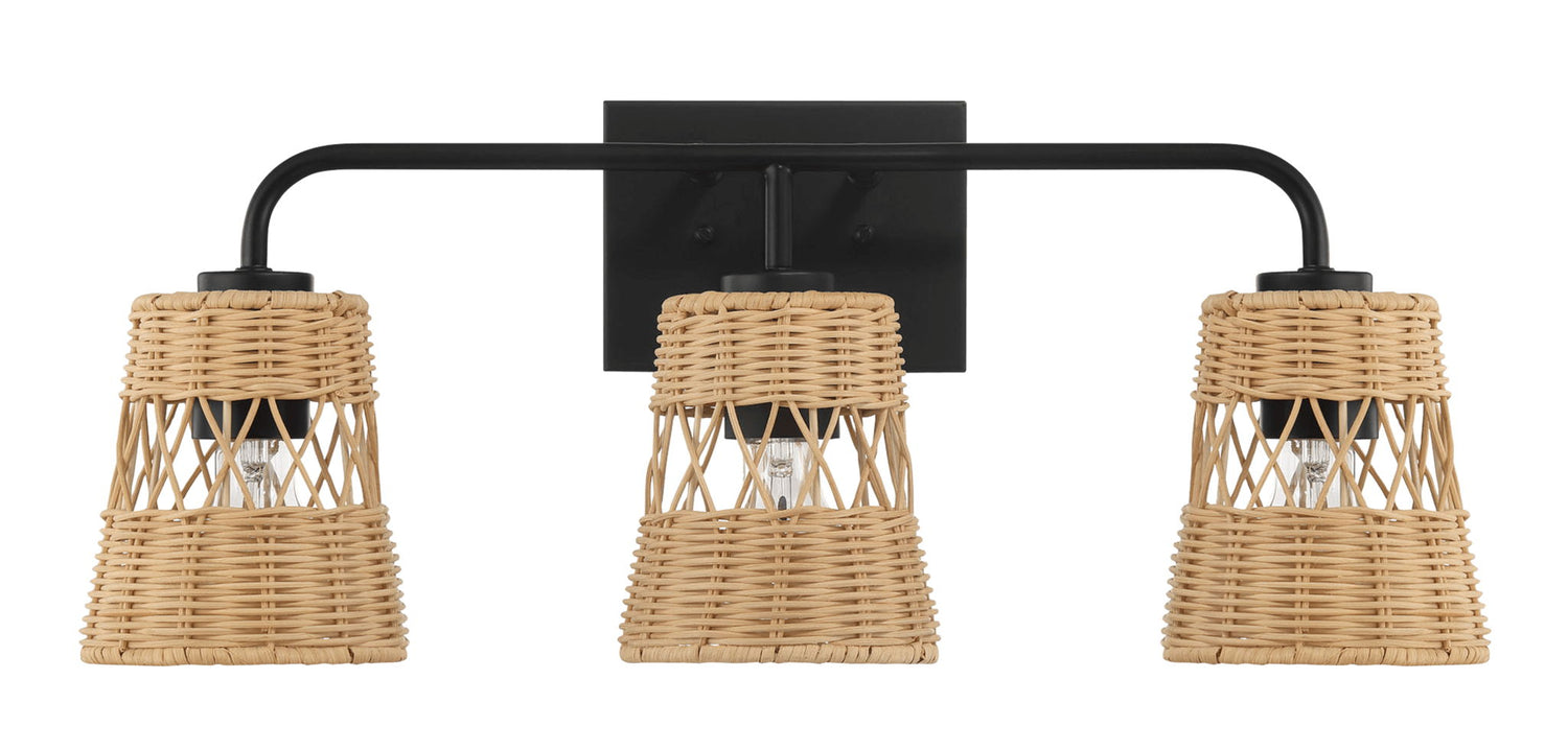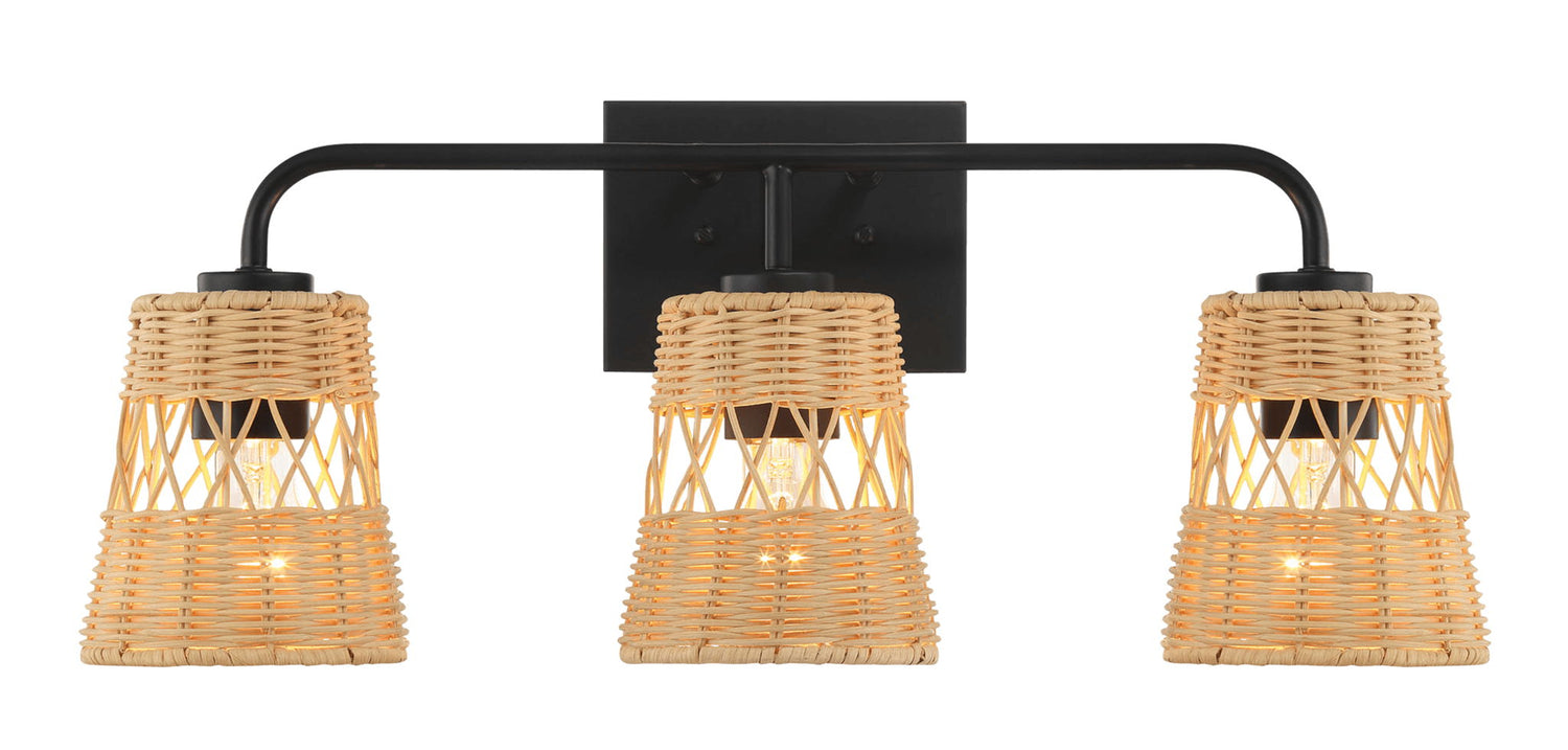 Moonlit - 3 Lights Wall Sconce With Shade, Bathroom Lighting Fixtures Over Mirror - Black / Rattan