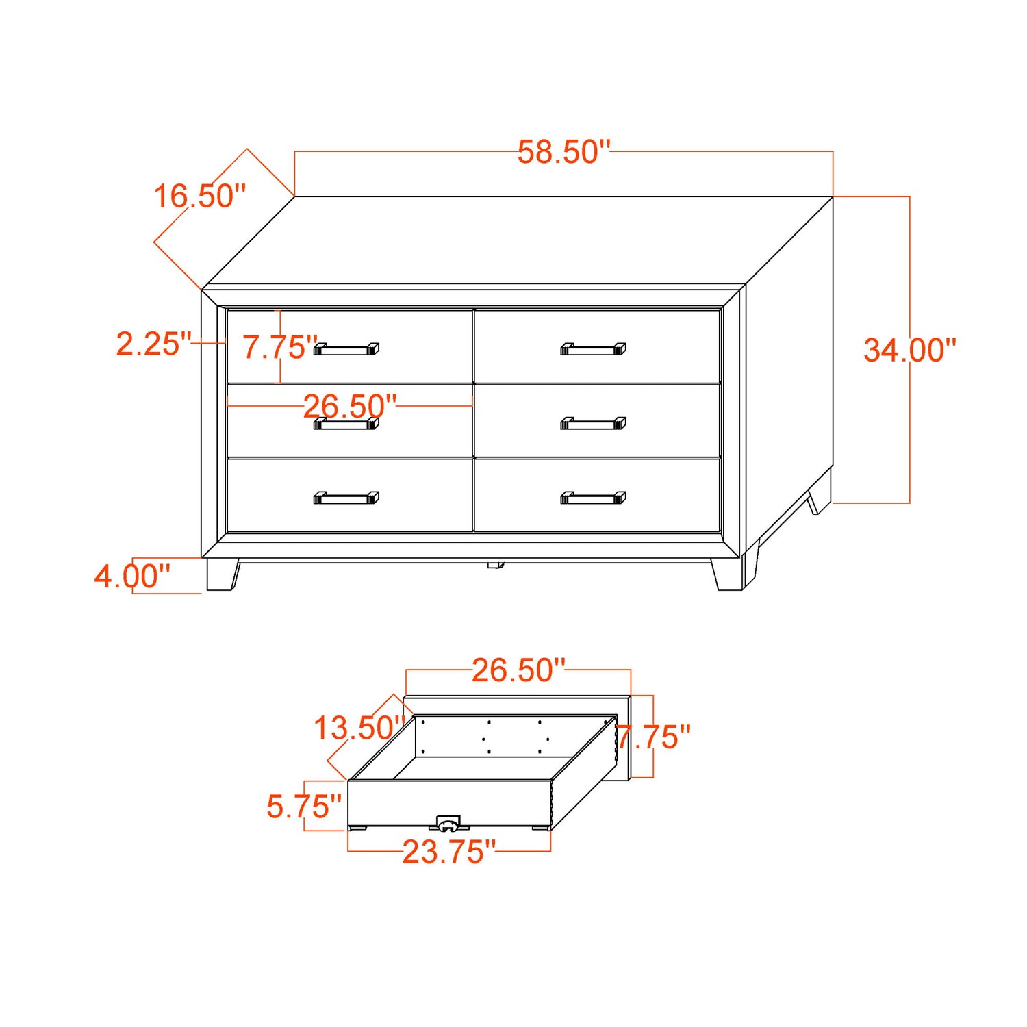 58.43"W x 16.54"D x 34.06"H - 134.53 lb