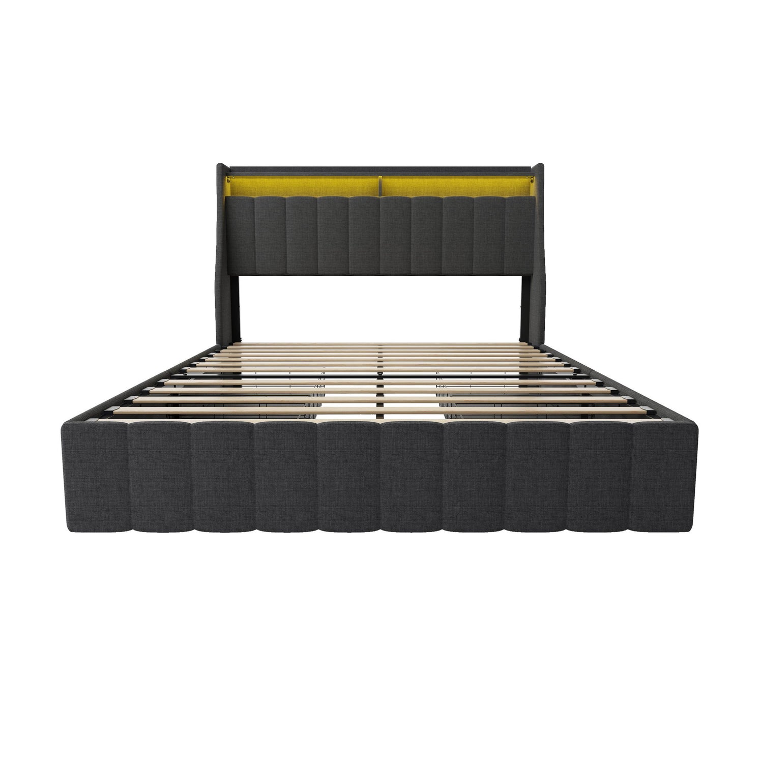 Full Size Bed Frame With LED Lights, 4 Drawers, Winged Headboard Upholstered - Dark Gray
