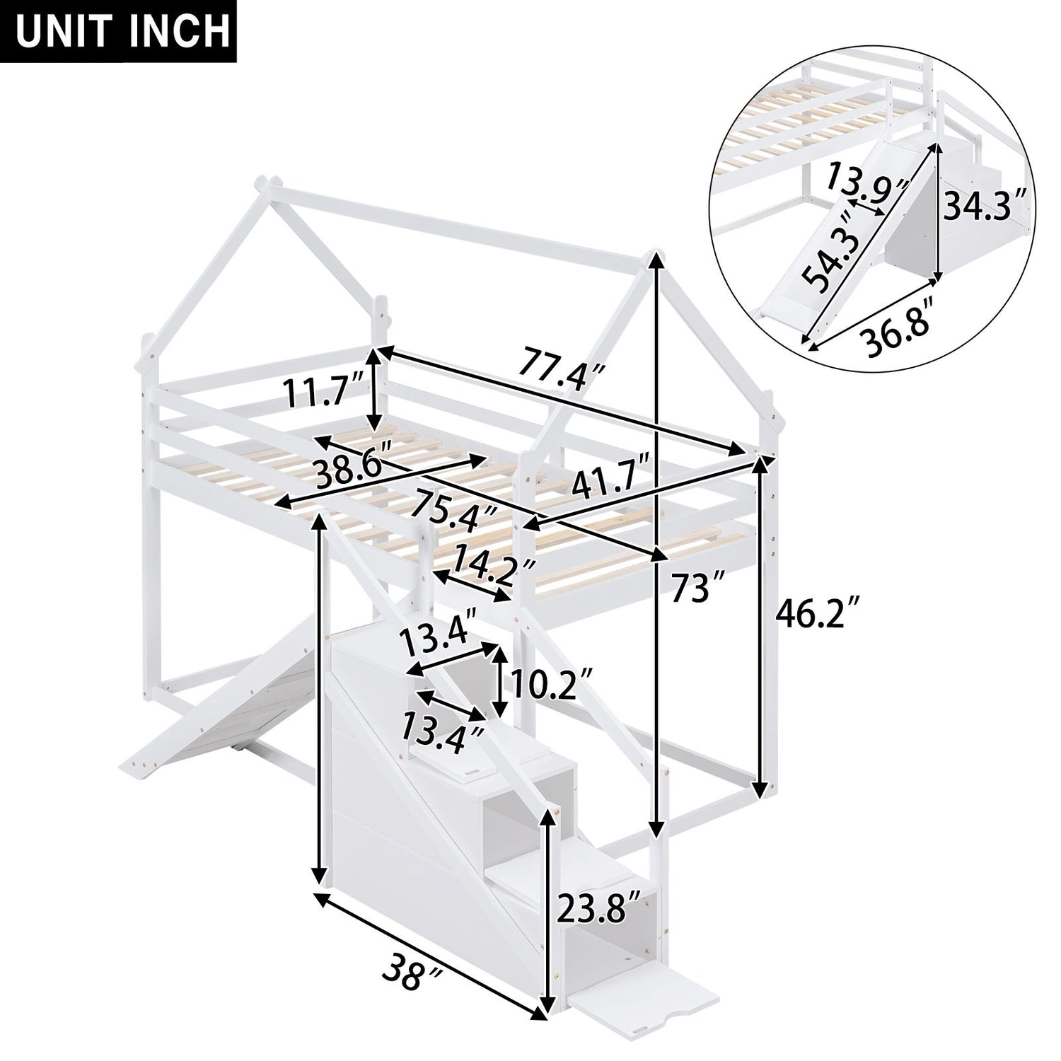 Twin Over Twin House Loft Or Bunk Bed With Slide And Staircase - White