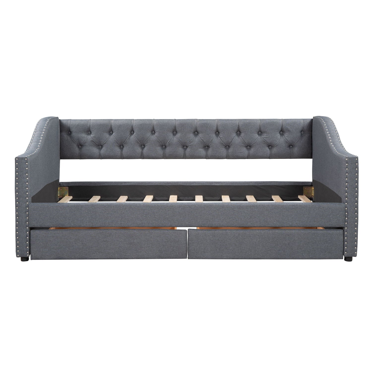 Twin Size Upholstered Daybed With Two Drawers, Slat Support - Gray