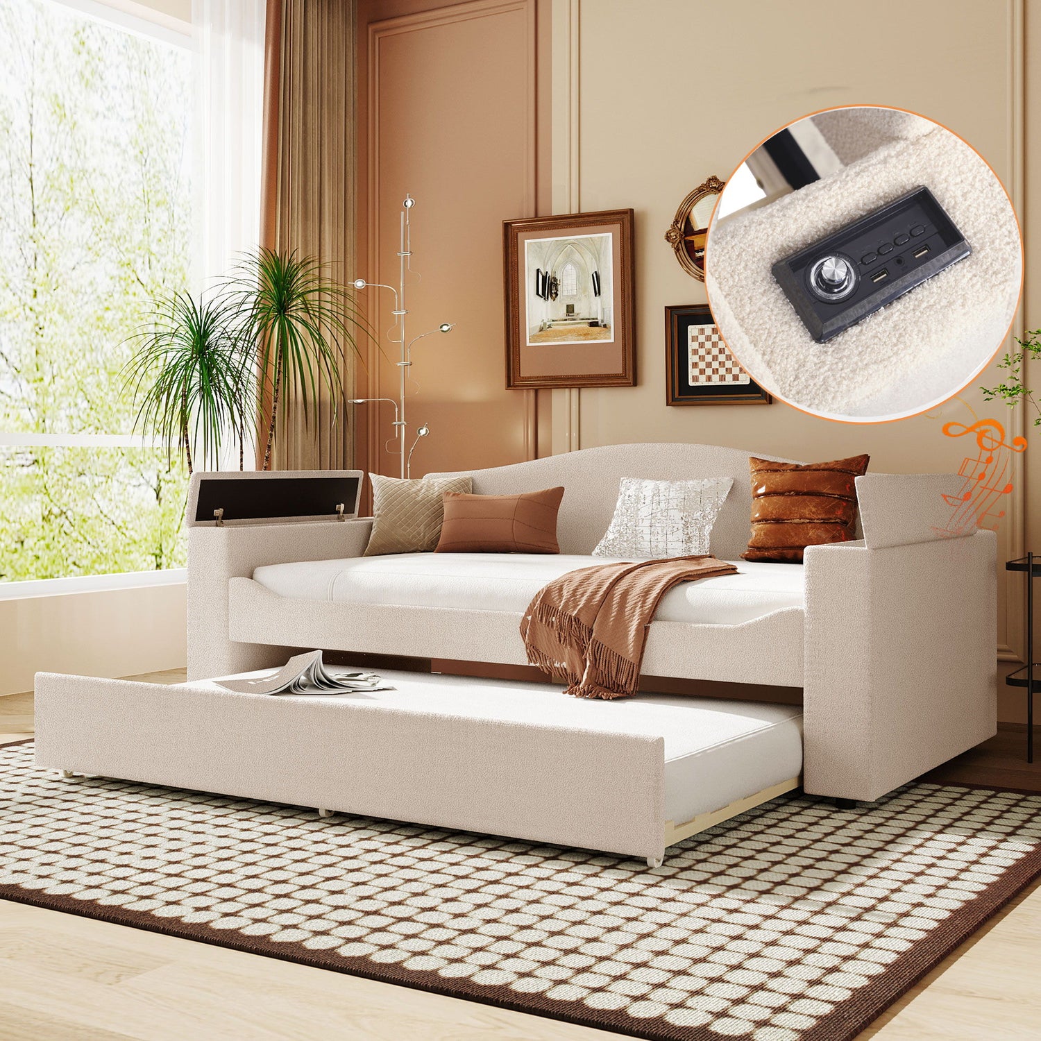 Twin Size Upholstered Daybed With Storage Armrests, Trundle And Latest Integrated Bluetooth Audio System - Beige