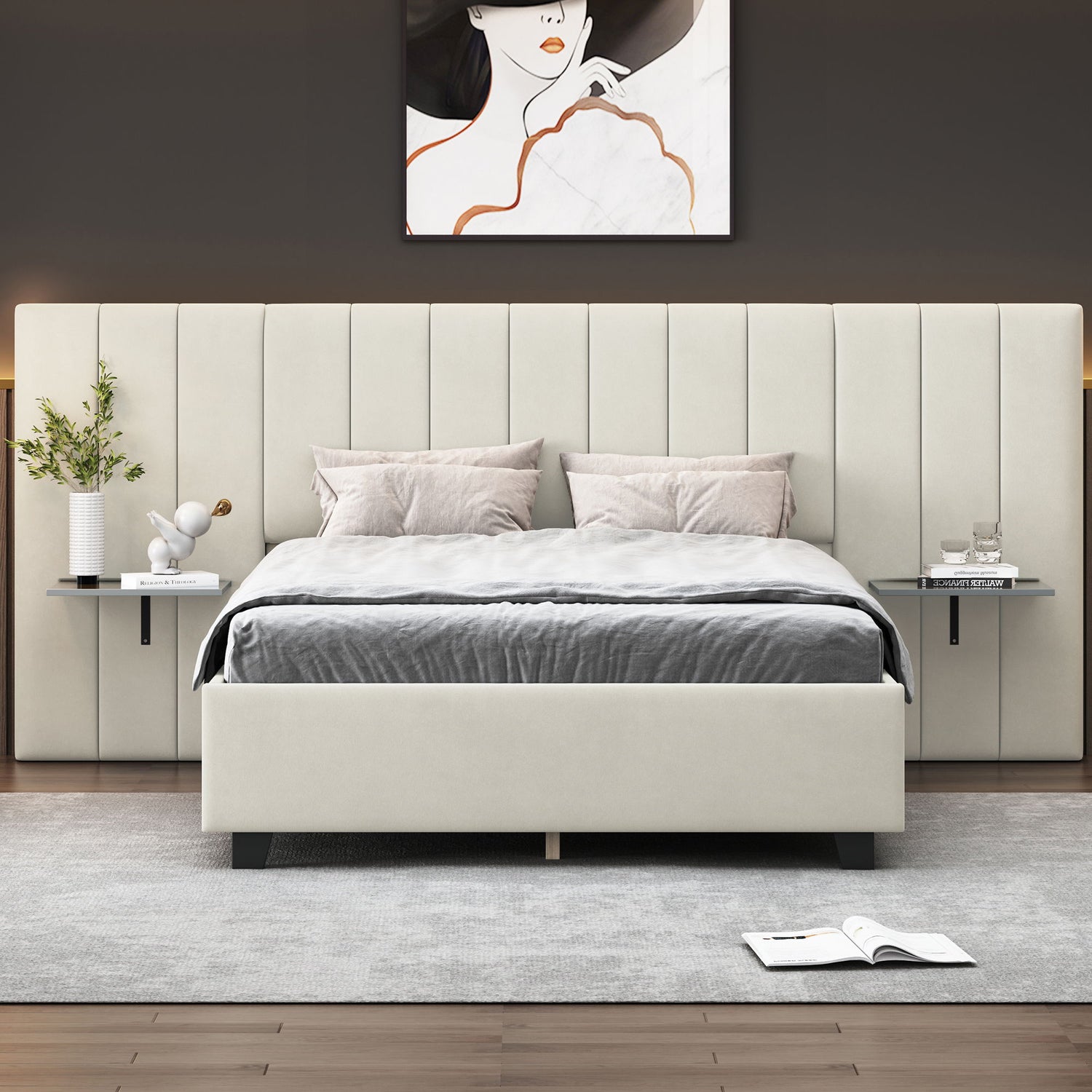 Queen Size Upholstered Platform Bed With Big Headboard - Beige