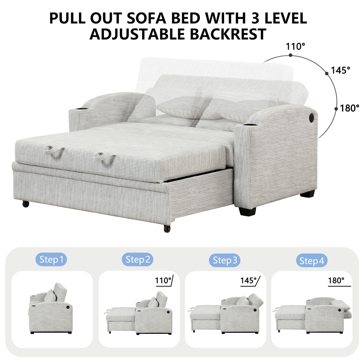 Pull Out Sofa Bed Modern Chenille Convertible Loveseat Sofa With Adjsutable Backrest, 2 Pillows, Cup Holders, USB Ports For Living Room, Apartment - White / Gray