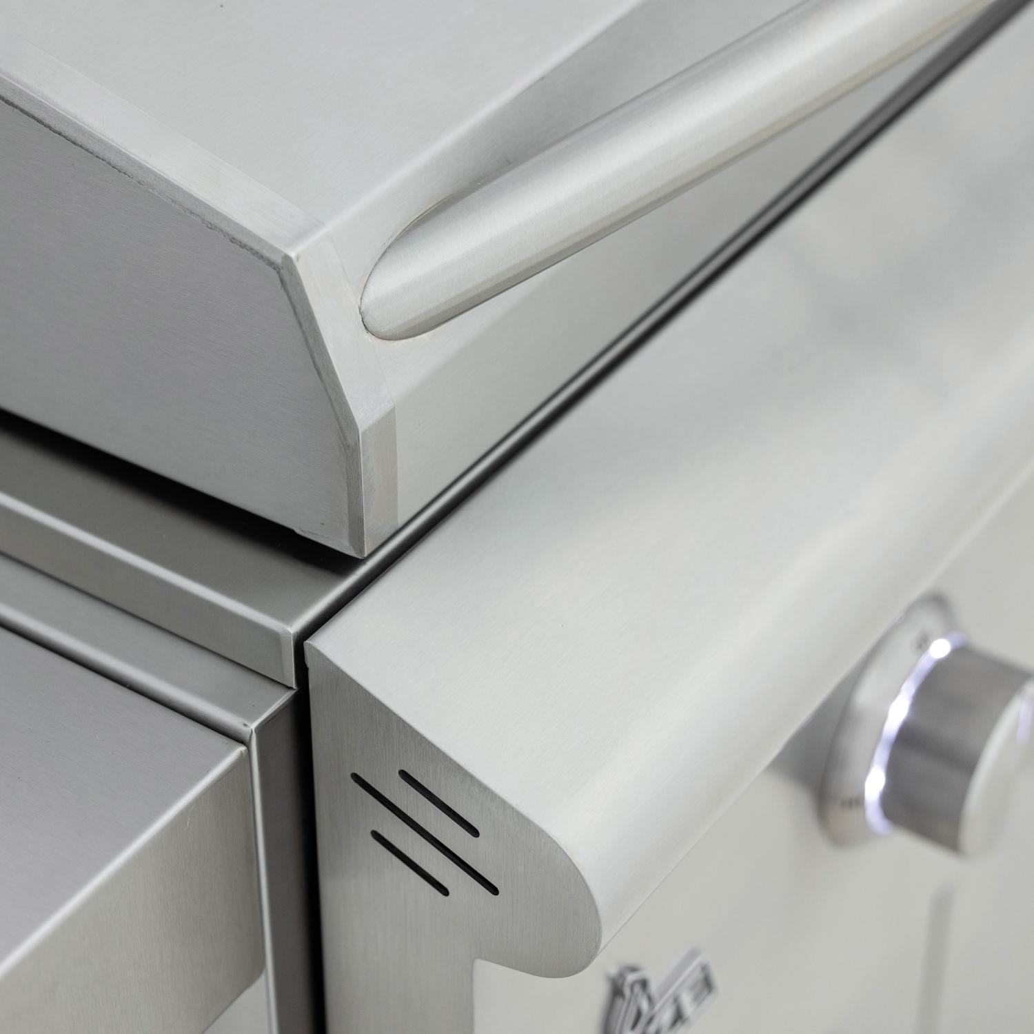 Safety features have been updated on this griddle, including larger peepholes on the front that allow for clear and safe visibility of the burners, so you can monitor your cooking conditions. Another safety upgrade is the enhanced, front-facing drip trough with grease-management channels that auto-seats and locks in place to ensure effortless cleanup. The updated LED knob lights feature temperature indicators for safety, shining red when gas is flowing, and enhance visibility for nighttime grilling.