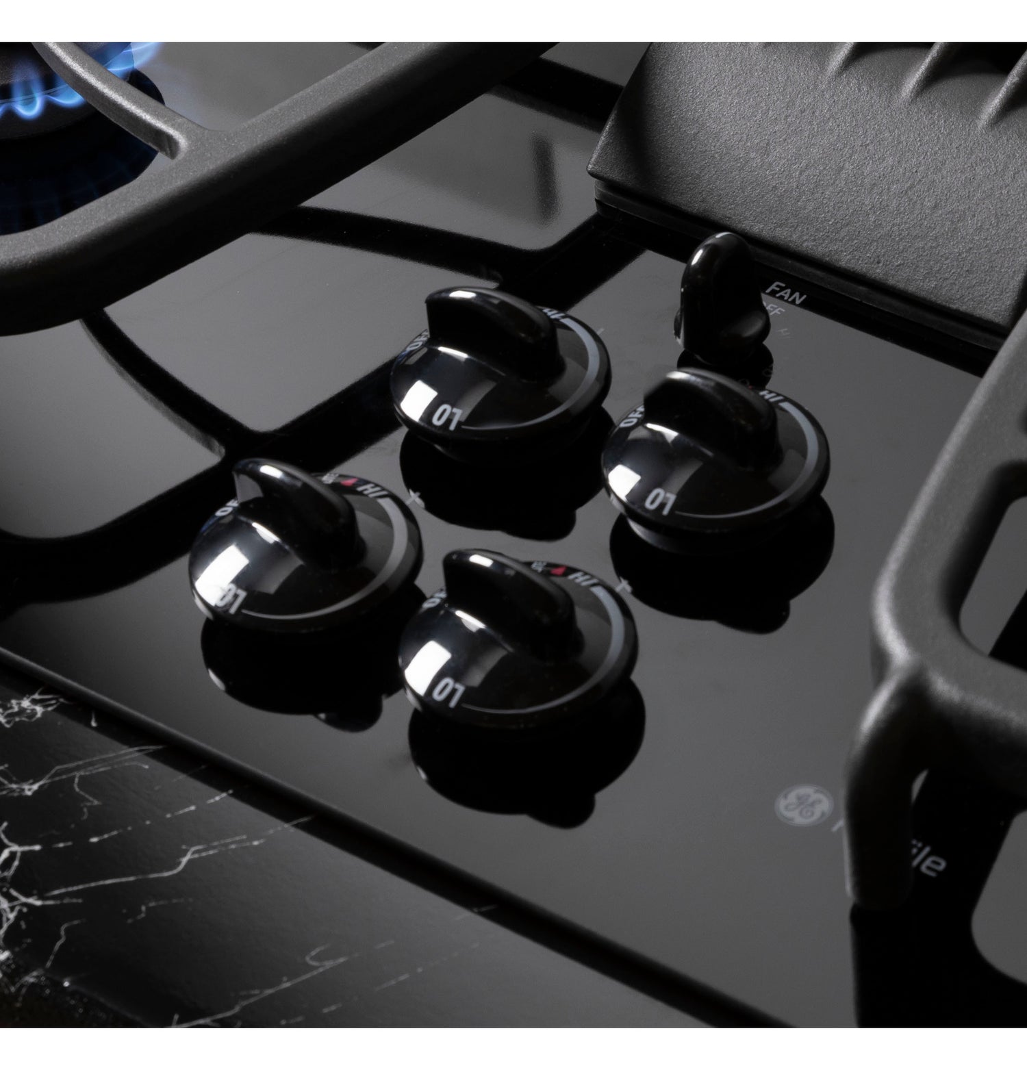 (BR)(B)Fit Guarantee(/B)(P)Replacing a similar cooktop from GE Appliances or another brand? GE cooktops are guaranteed for an exact fit or GE Appliances will pay up to $100 toward modifications. See offer criteria and details(/P)(BR)(B)Four gas cooking burners(/B)(P)Cook foods quickly and evenly with all-purpose burners(/P)(BR)(B)Gas on Glass Cooktop(/B)(P)Sleek and easy to clean cooking surface(/P)(BR)(B)11,500 BTU all-purpose burner(/B)(P)Delivers a wide range of heat output for most cooking needs(/P)(BR)(B)Downdraft exhaust(/B)(P)Powerful exhaust system effectively pulls smoke and steam out of the kitchen(/P)(BR)(B)Spend Less Time Cleaning Up(/B)(P)Sealed cooktop burners contain spills and make cleaning quick and easy(/P)(BR)(B)Knob controls with black glass surface(/B)(P)Achieve a modern look with the convenience of knob controls(/P)(BR)(B)Dishwasher-safe grates and knobs(/B)(P)Safe to clean in the dishwasher(/P)