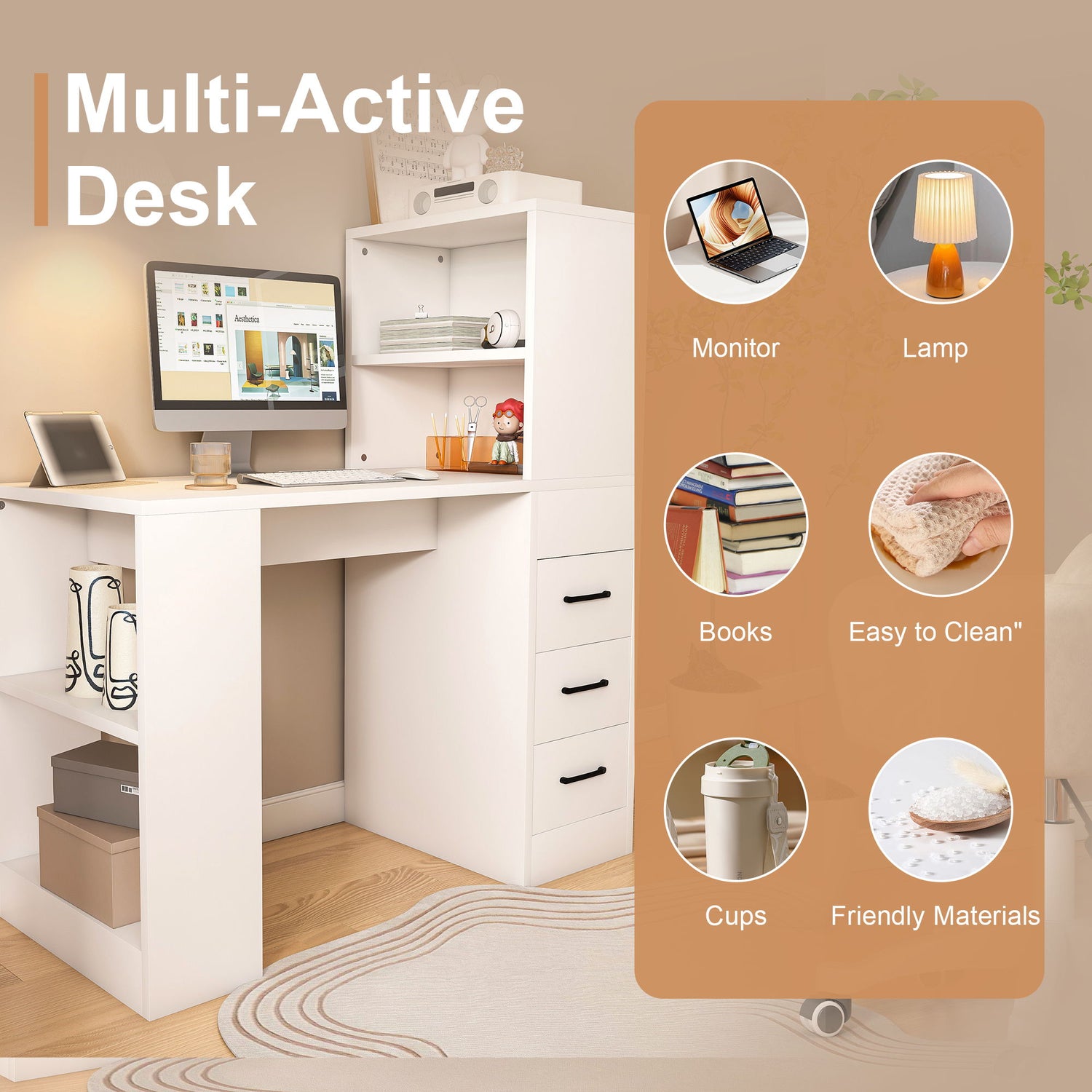 - 4-in-1 Integrated Charging Station: Includes AC outlet and USB ports for convenient device charging at the desk.