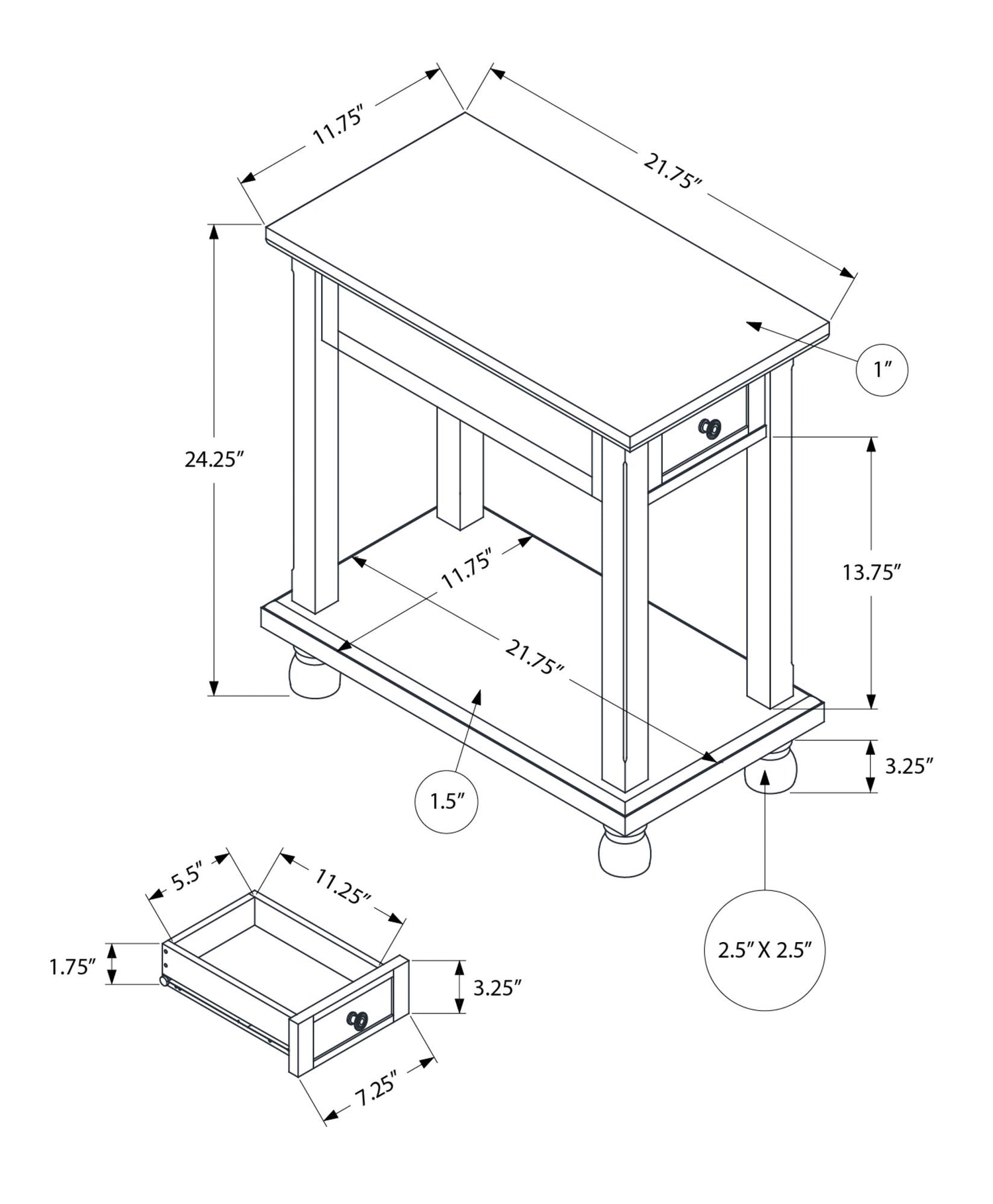 • Compact Dimensions: The table measures 11.75 inches wide, 21.75 inches long, and 24.25 inches high, making it a perfect fit for tight spaces without compromising functionality.