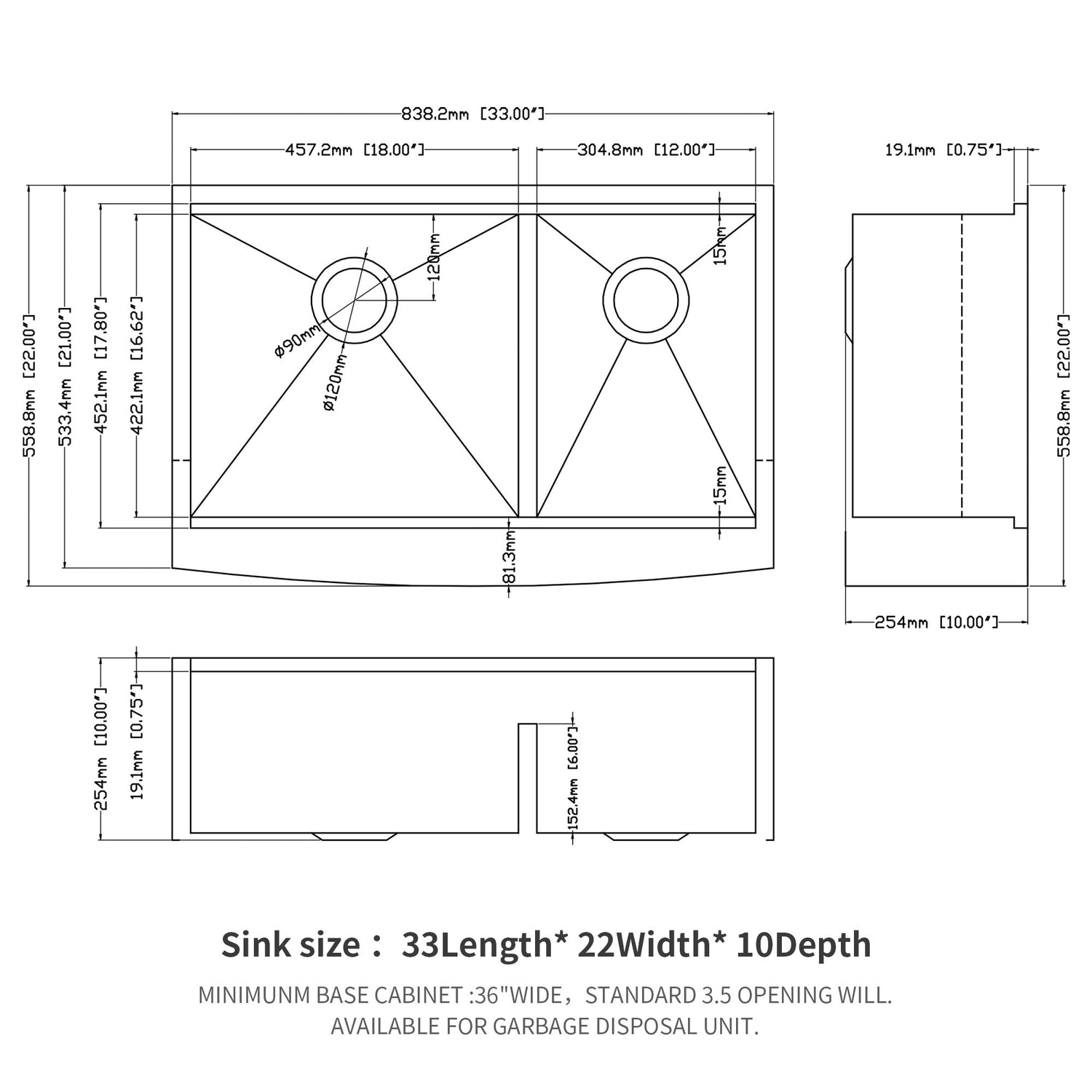 Double Bowl Farmhouse Sink Workstation 33" Stainless Steel 16 Gauge Apron Front - Black / Gray