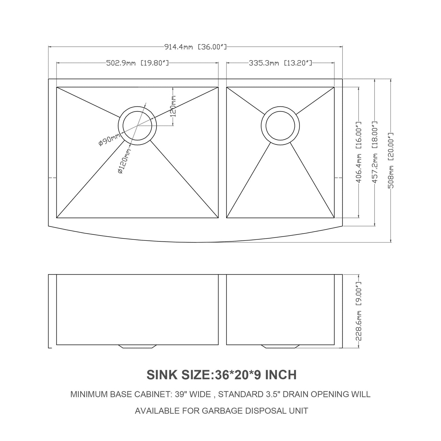 Sink With Double Bowl, 60 / 40 In 36" X 20" X 9" Apron Front Kitchen Sink, 16 Gauge T304 Construction - Brushed Nickel