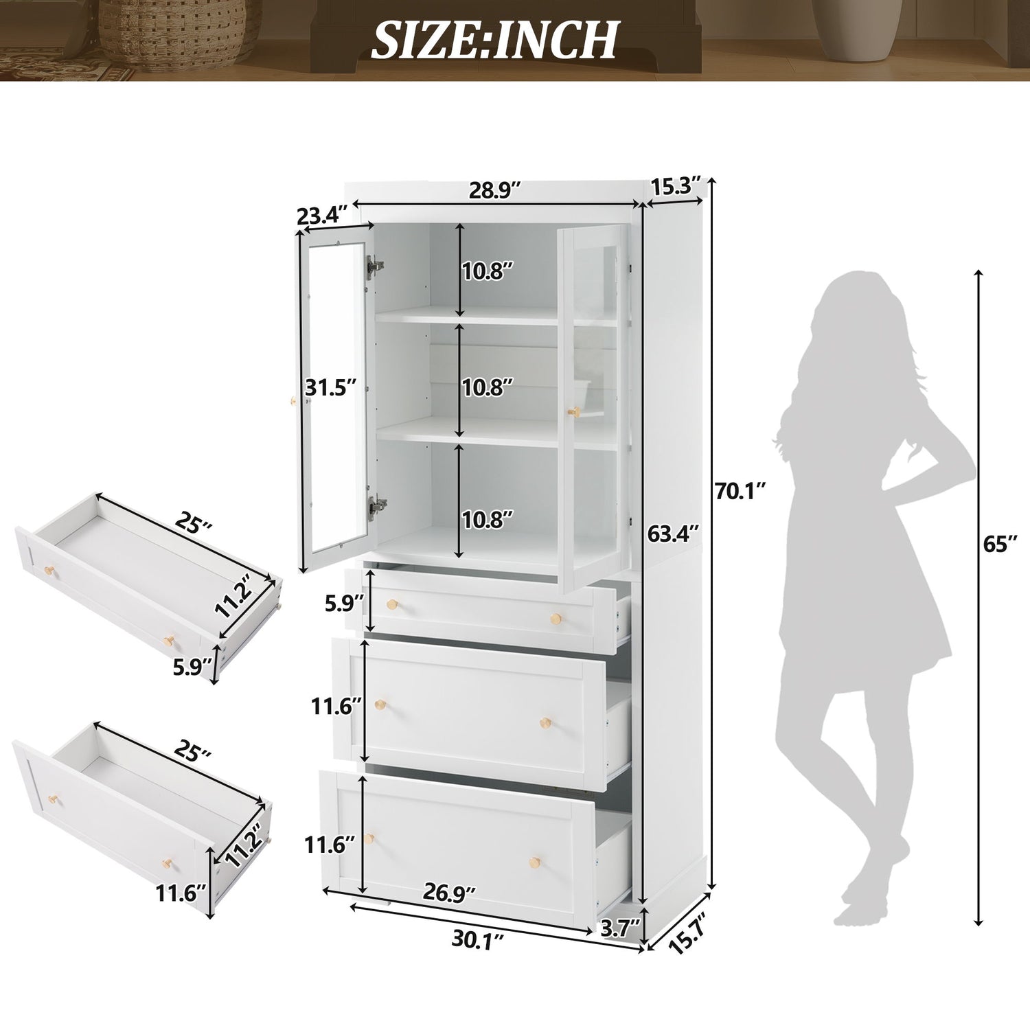 Freestanding Tall Bathroom Cabinet With 2 Adjustable Shelves, 3 Drawers, Soft Close Glass Doors - White