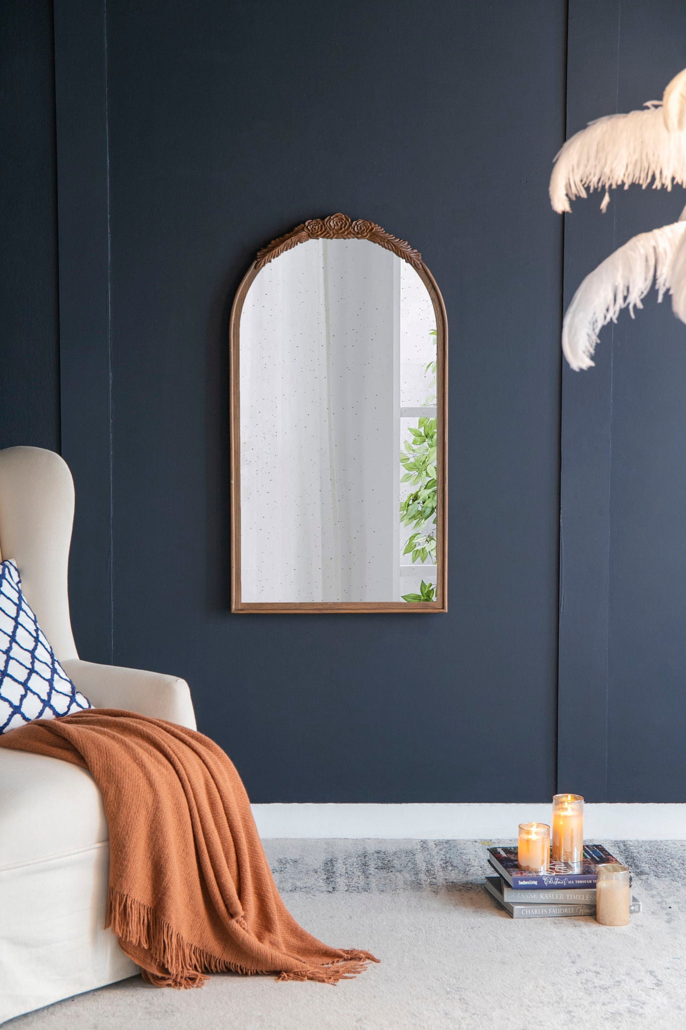 Hand Carved Rose Antique Mirror Frame, Wood Arch Mirror Wall Decor For Living Room, Bathroom, Entryway - Brown