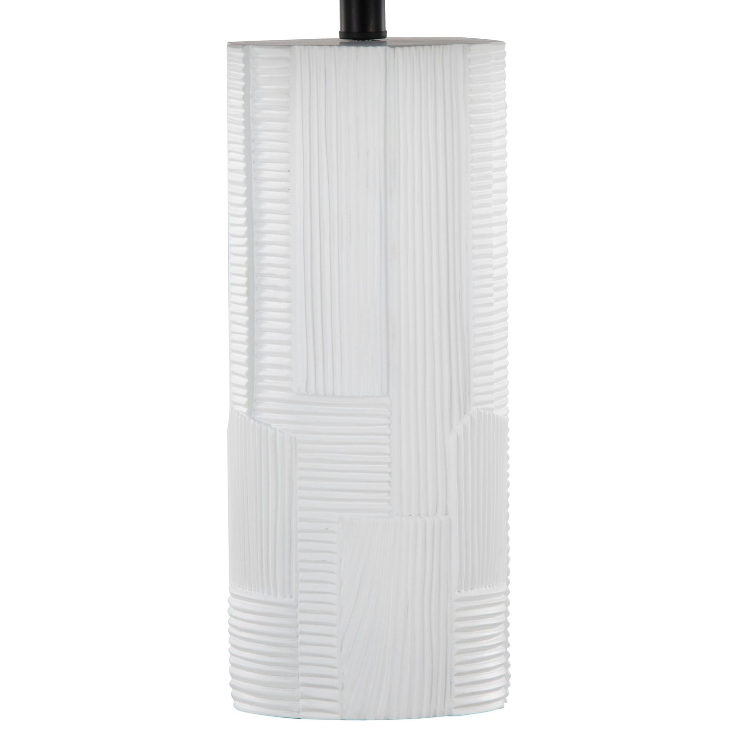 - Glam/Art Deco Styling: This lamp embodies glam and art deco styling, featuring a textured polyresin base complemented by black metal accents.