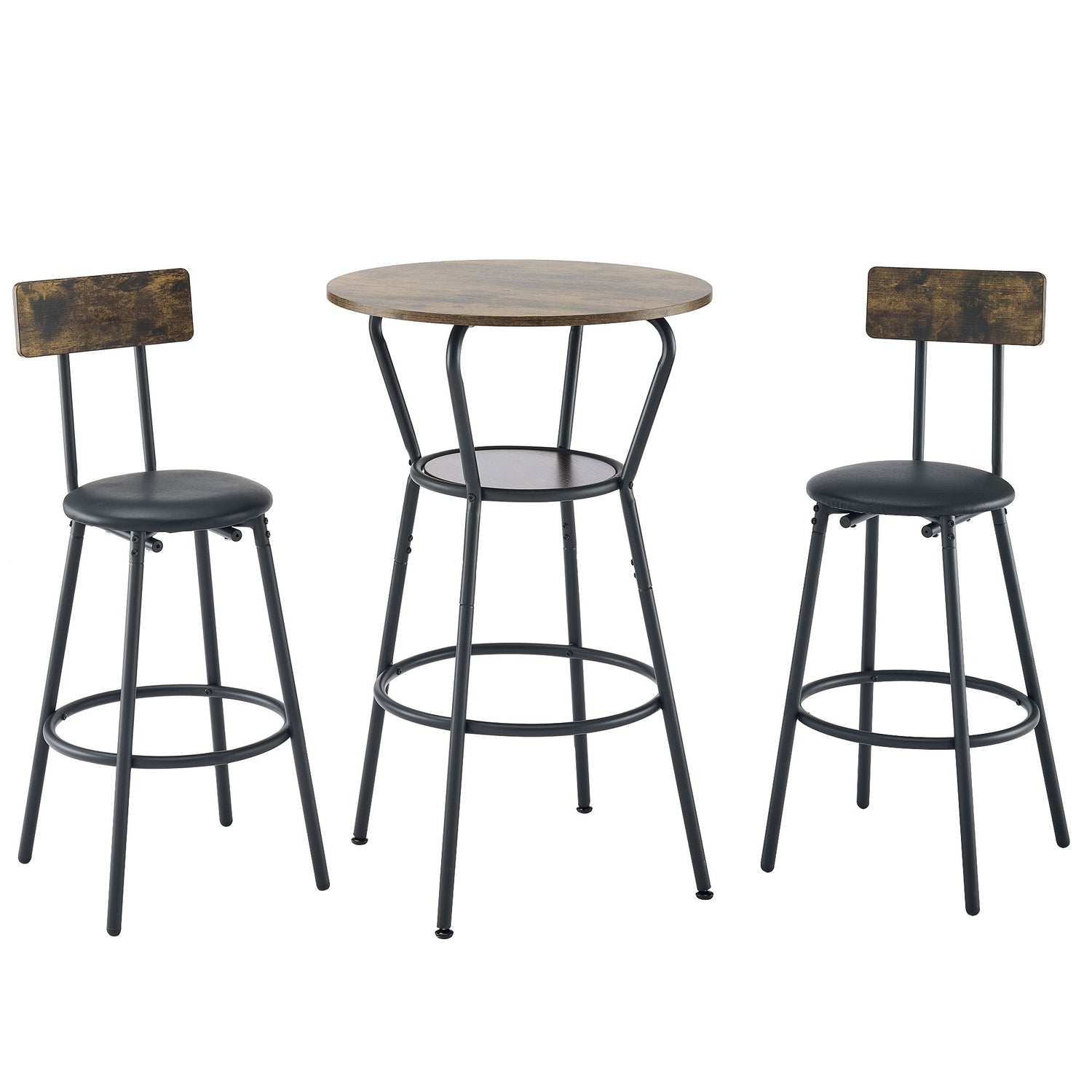 Rustic Brown Round Bar Table And Stool Set With Shelf, Upholstered Stool With Backrest - Antique Brown