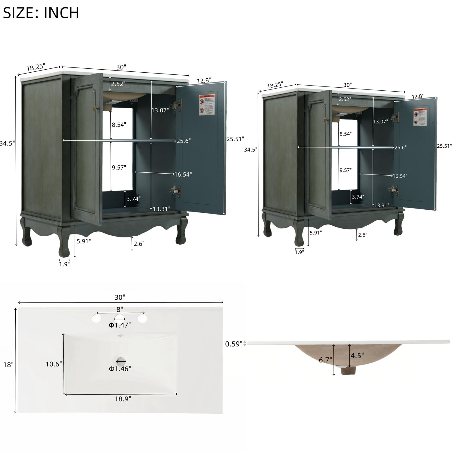 • Seamless Cohesive Vintage Charm: Matching 30-inch vanities with identical antique knobs and weathered finish create a unified retro look when combined.
