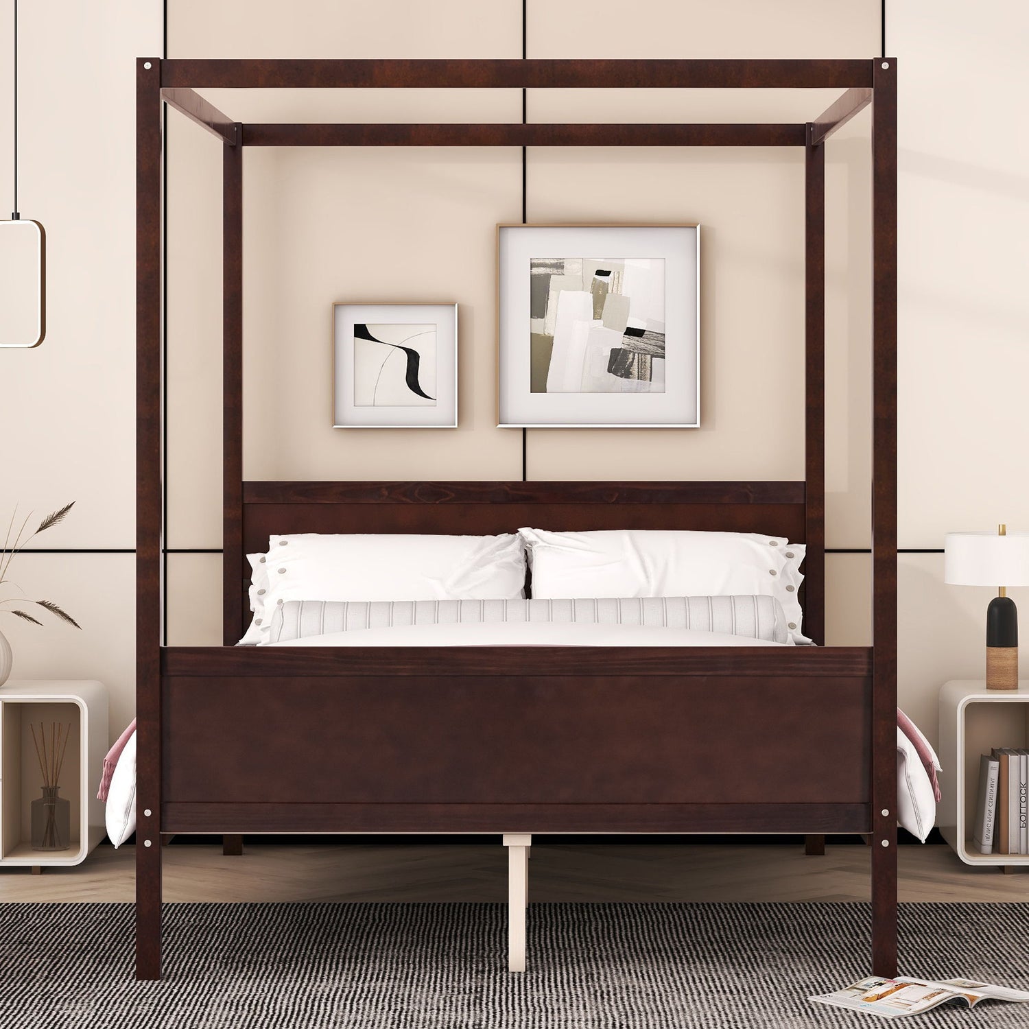 Modern Design: This wooden canopy bed features a sleek, timeless design with a beautiful finish, built-in headboard, and footboard. Its clean lines create an elegant and sophisticated look for any bedroom.