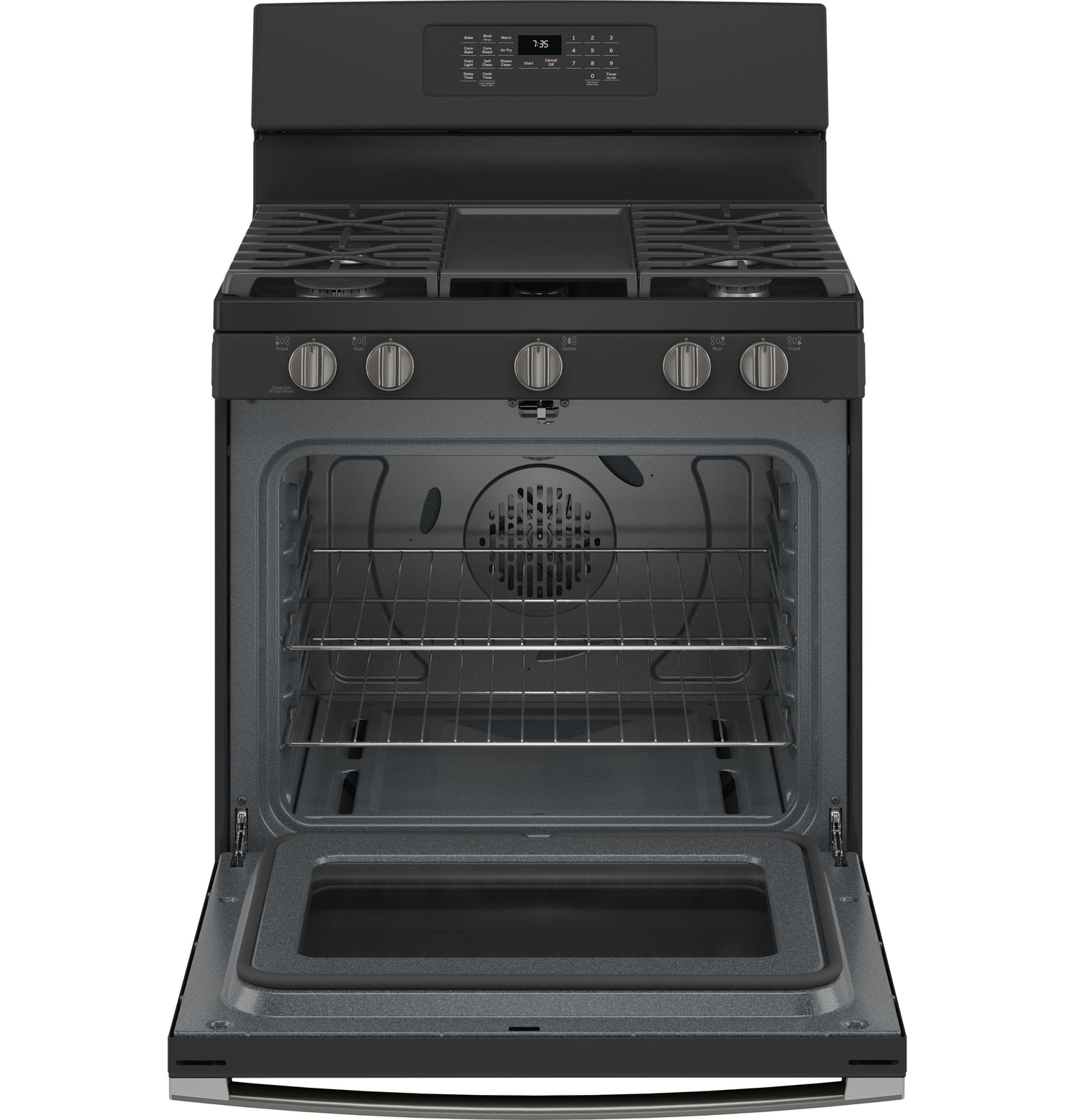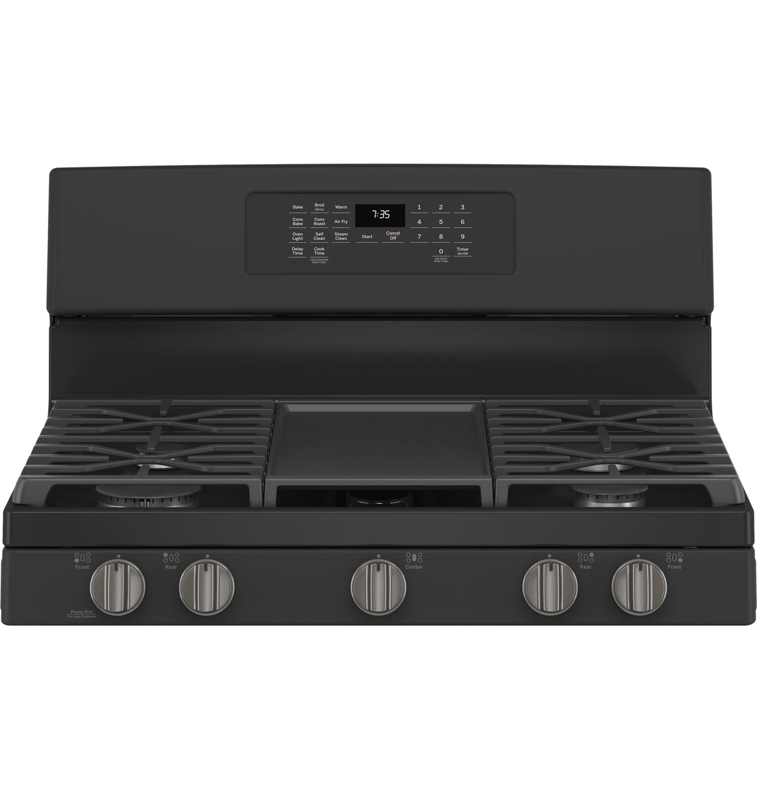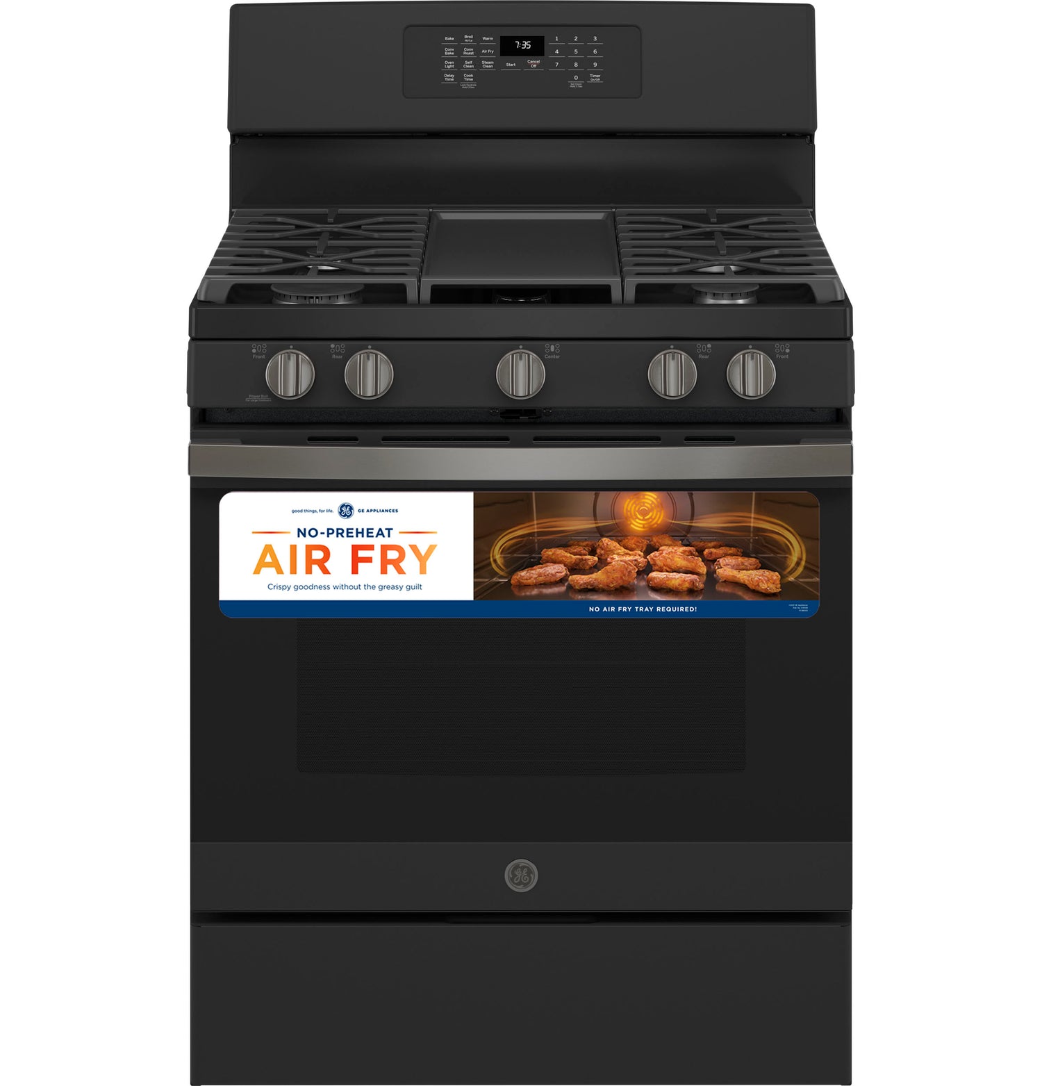 (BR)(B)No Preheat Air Fry(/B)(P)Cook healthier, crispier versions of your favorite foods in less time, thanks to an air fryer right in your oven that doesn't require preheating, a basket or a special tray(/P)(BR)(B)Edge-to-edge cooktop(/B)(P)Continuous, edge-to-edge cooktop give you a large cooking space and can handle any cookware(/P)(BR)(B)Integrated griddle(/B)(P)This integrated non-stick griddle leads the industry in size and quality, so you can cook a lot of food at once(/P)(BR)(B)Power boil burner(/B)(P)This 18,000-BTU power boil element produces intense heat to boil water fast(/P)(BR)(B)Precise Simmer Burner(/B)(P)This burner setting provides low, even heat so delicate dishes don't burn(/P)(BR)(B)Convection(/B)(P)This gas convection oven cooks and browns more evenly, using a rear fan to circulate hot air(/P)(BR)(B)Self-clean with steam clean(/B)(P)This self-cleaning oven uses optional steam cleaning for light soils to clean the oven cavity with less heat and odor(/P)(BR)(B)Cente