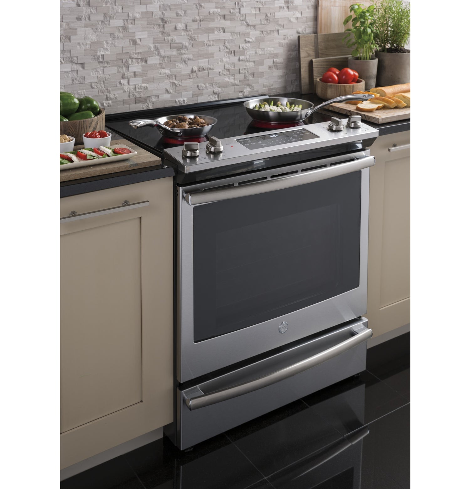 (BR)(B)Fit Guarantee(/B)(P)Replace your old 30" free-standing range with a new 30" slide-in model. GE slide-in ranges are guaranteed for an exact fit or GE Appliances will pay up to $300 toward modifications. See offer criteria and details(/P)(BR)(B)12"/9" dual element(/B)(P)Two heating elements in one offer flexibility(/P)(BR)(B)True Convection with Precise Air(/B)(P)Accurate heat circulation ensures evenly baked foods(/P)(BR)(B)9"/6" Power Boil element(/B)(P)Produces rapid, powerful heat(/P)(BR)(B)Fifth element warming zone(/B)(P)Provides low-heat capability for foods(/P)(BR)(B)Fast preheat(/B)(P)Make hot meals in a hurry with less time preheating(/P)(BR)(B)Self-clean with Steam Clean option(/B)(P)Clean your oven the way you want(/P)(BR)(B)Hidden bake oven interior(/B)(P)Make cleanup easy by eliminating hard-to-reach areas(/P)(BR)(B)Smooth-glide storage drawer(/B)(P)Drawer opens and closes easily for instant access and extra storage(/P)
