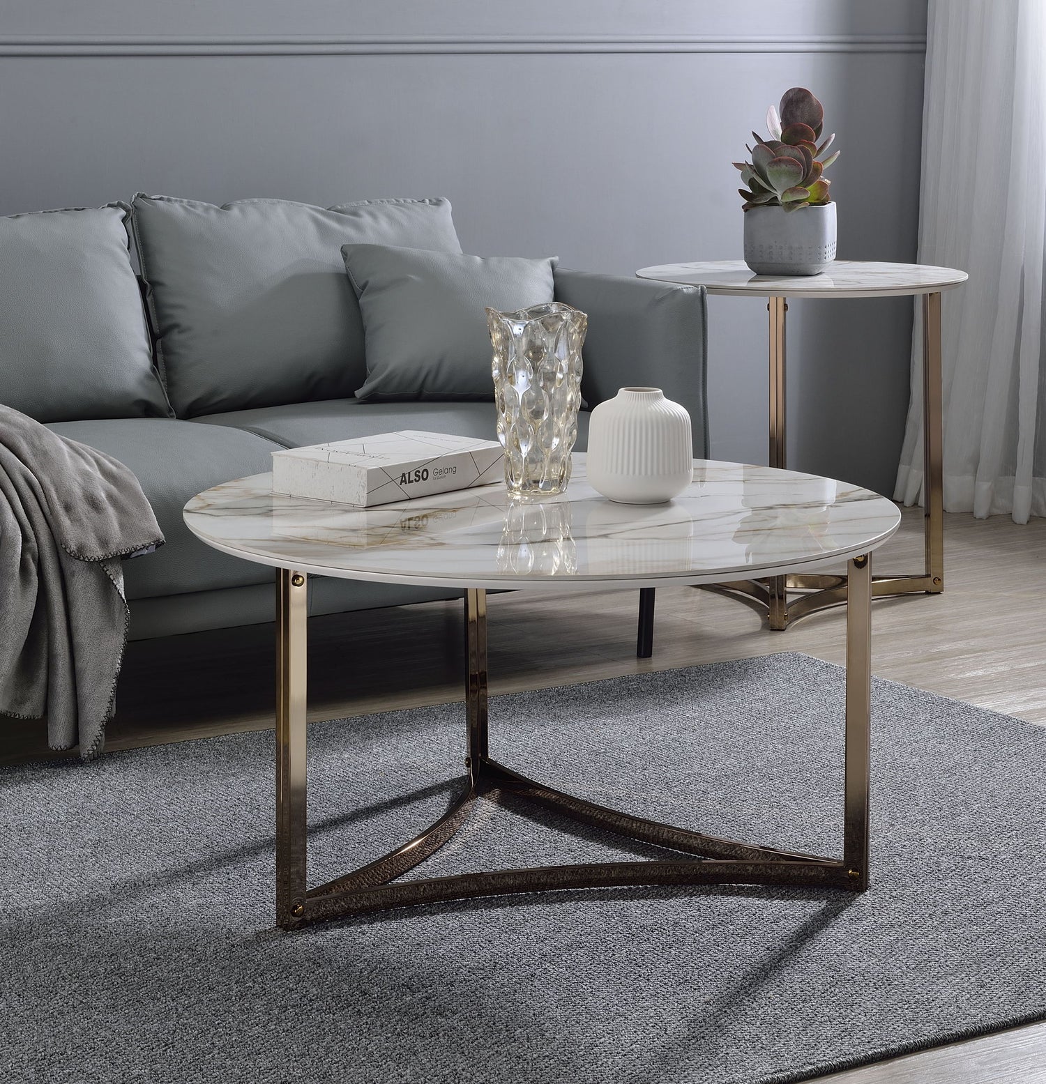 - Elegant Design: This coffee table features a round sintered stone top that combines durability with a sleek, high-end appearance, complemented by a sophisticated champagne finish for a luxurious touch.