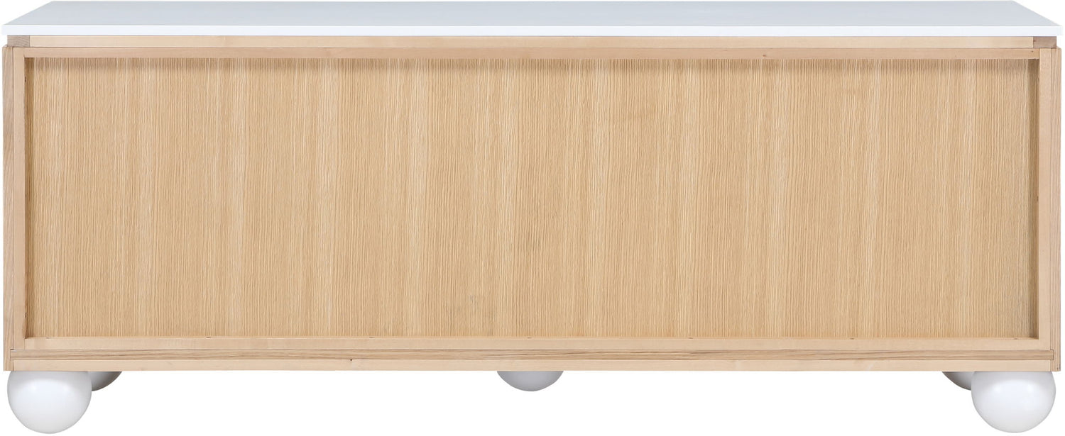 Transform your dining space into a haven of modern elegance with the Cardiff Black Sideboard Buffet. Featuring a rich oak finish contrasted with white lacquer legs and a lacquer top, it creates a sleek and modern aesthetic. Crafted mostly from solid wood with oak veneer made from rubberwood, as well as some parts made from MDF plywood, it boasts natural wood grain variation for added charm. This versatile piece serves as an elegant storage solution and a stylish platform for decorations. With doors designed to conceal cutlery, dishes, napkins, and dining supplies, it ensures your dining area stays organized and clutter-free. Elevate your dining experience with this handsome sideboard buffet that meshes practicality and sophistication effortlessly.