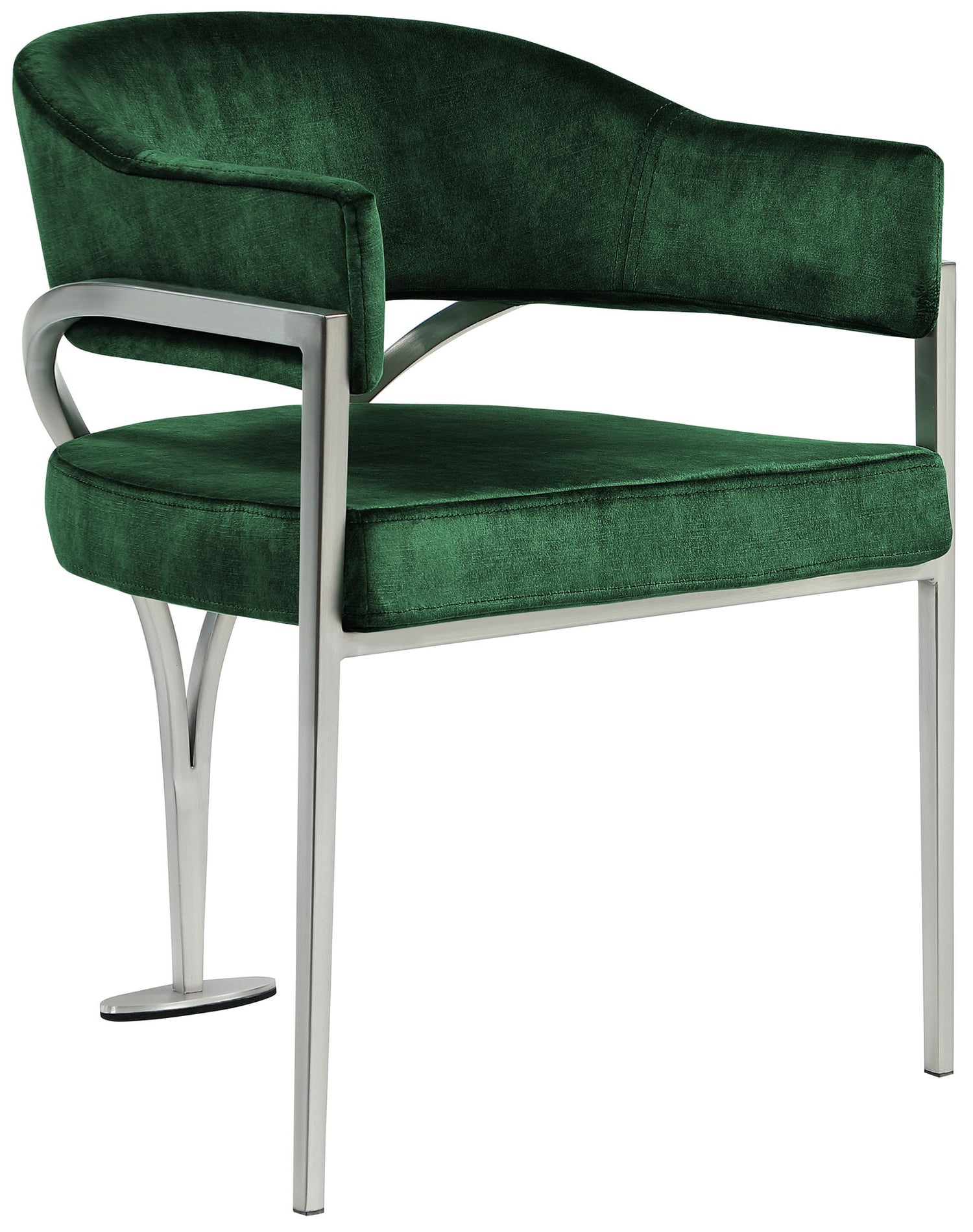 Give your dining area a show-stopping new look when you bring home one or more of these Madelyn velvet dining chairs. The Madelyn chair is all about comfort and style with its barrel-back design and its sophisticated lines. Upholstered in luxurious biege velvet that's inviting to the skin and super soft to the touch, this chair features an iron metal frame for durability and lasting use in your busy home. The brushed chrome finish adds a final modish touch to this lovely dining chair.