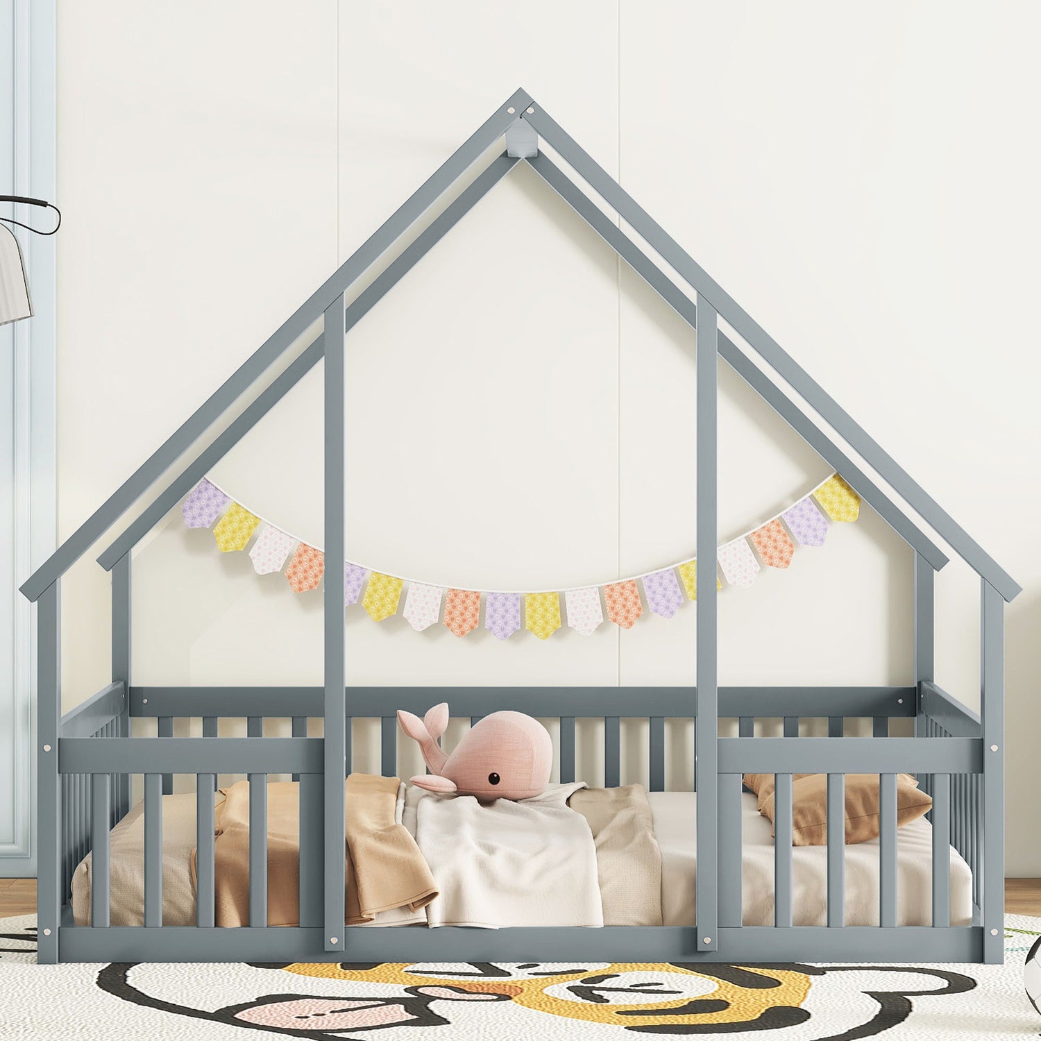 Twin Wood House-Shaped Floor Bed With Fence, Guardrails - Gray