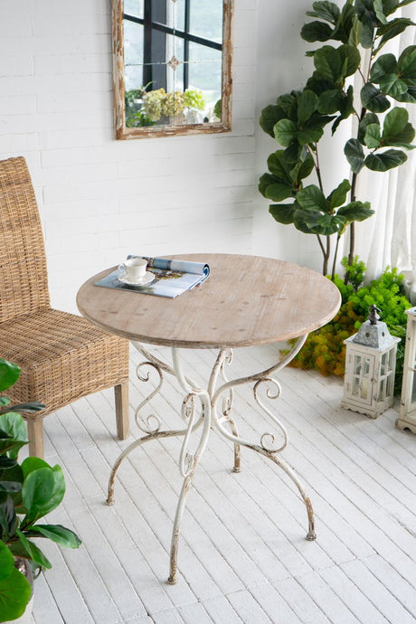 Round Wooden Table With Metal Scrollwork Legs - White Washed