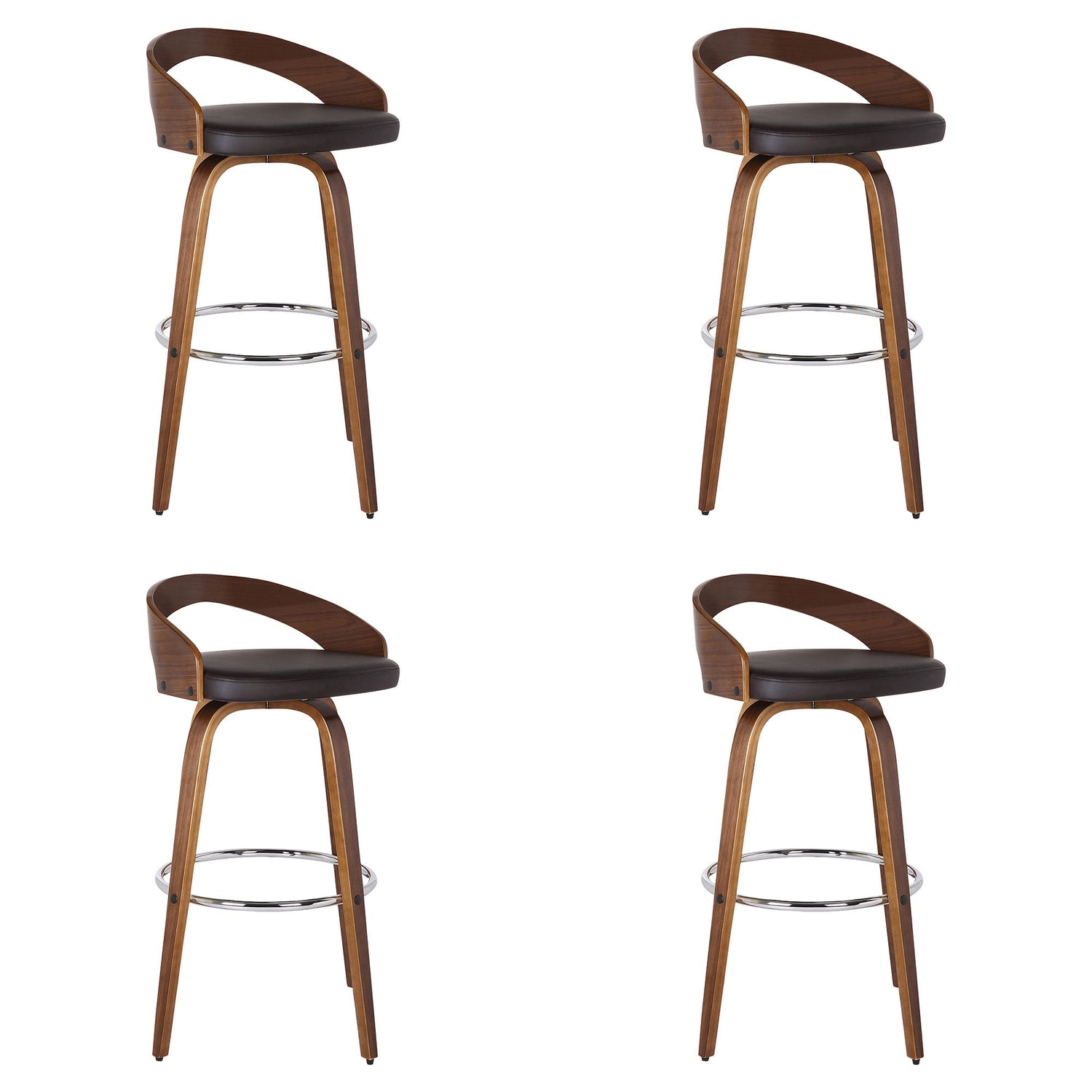 Add a touch of mid-century modern magic to your home with the Armen Living Sonia 26" Swivel Brown Faux Leather and Walnut Wood Counter Stool. Designed with comfort and style in mind, the Sonia features a 360-degree swivel that allows you to easily interact with your friends and family regardless of their place in the room! The curved wood low back is ideal for posture alignment and an unmatched support, its opening is perfect for breathable easy seating. The Sonia features a high-density foam cushion and beautiful faux leather upholstery that will allow you to sit or entertain for hours on end. The foundation of the product is supported by wood and chrome footrest for a chic and stylish aesthetic without comprising practicality and functionality of this item. The Sonia Swivel Faux Leather and Wood Counter & Bar Stool is available in a Walnut Finish with Brown, Gray, or Cream faux leather upholstery or Black Wood with Gray faux leather upholstery and a 26” or 30” seat height.