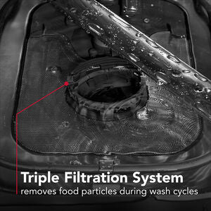Efficiently removes food particles with a three-stage filtration system that protects dishes and the machine.