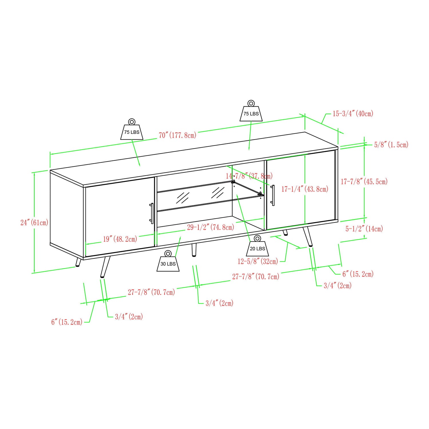 70.0"W x 15.75"D x 24.0"H - 81.0 lb