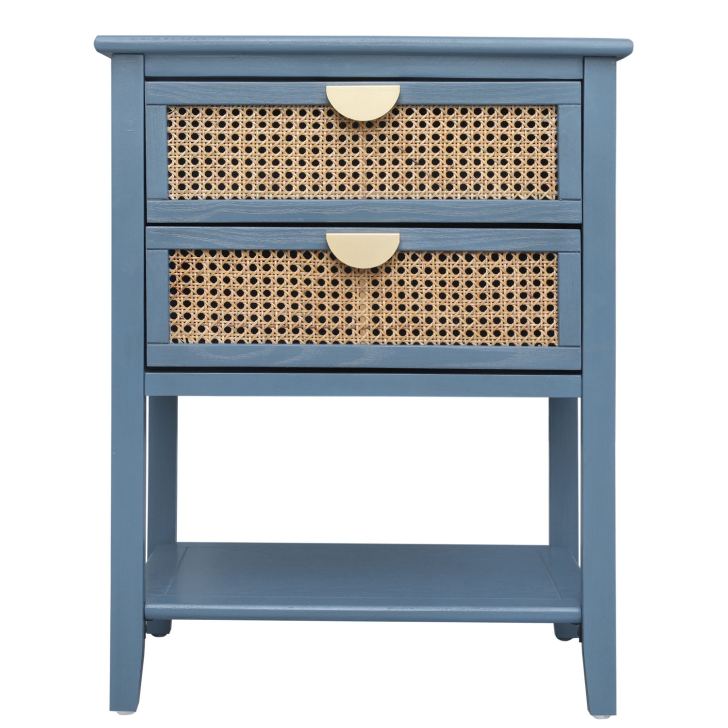 2 Drawer Side Table, Natural Rattan, American Furniture, End Table Suitable For Bedroom, Living Room, Or Study - Blue