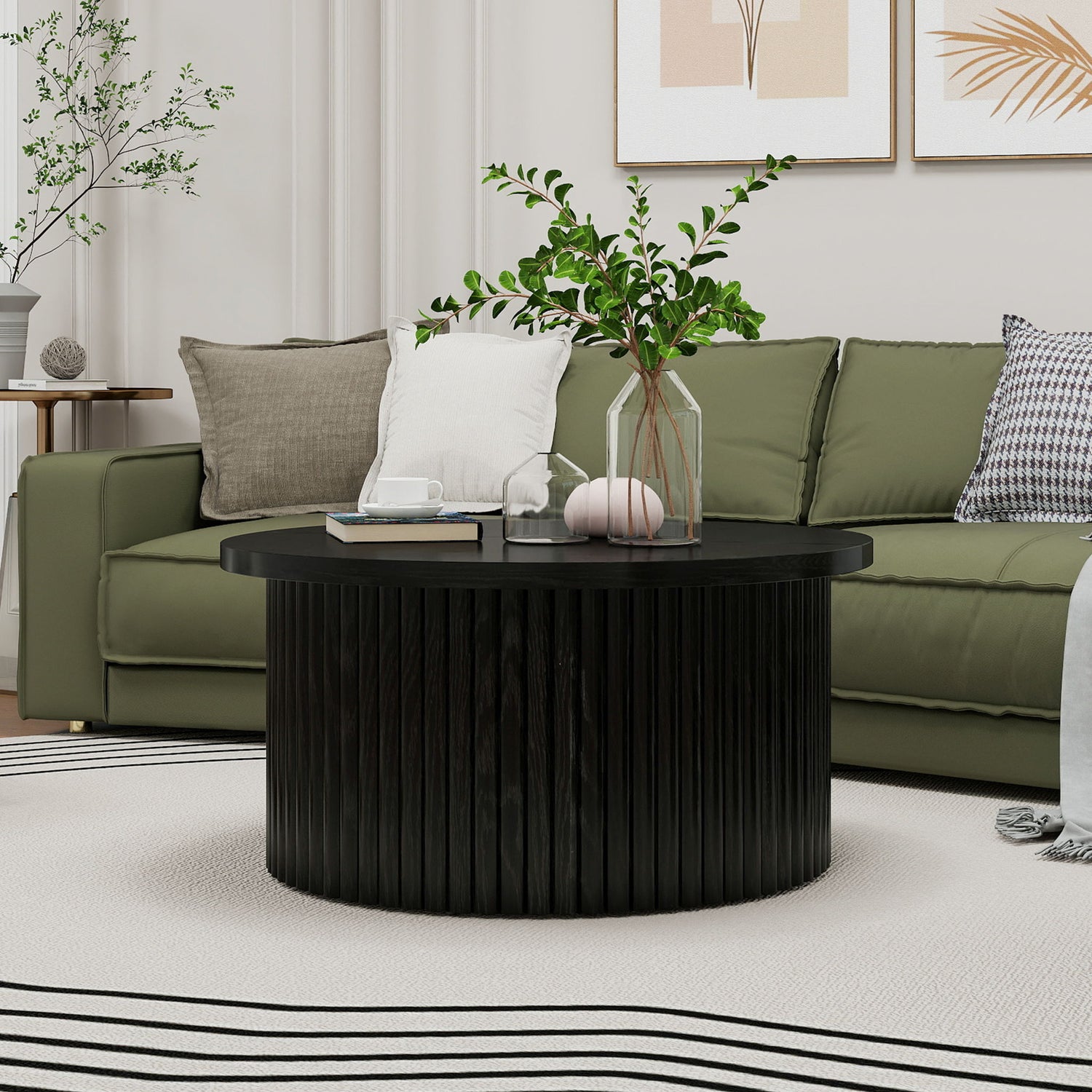 - Modern Design: Features a round shape with unique vertical wood grain stripes, offering a chic and stylish addition to your living room.