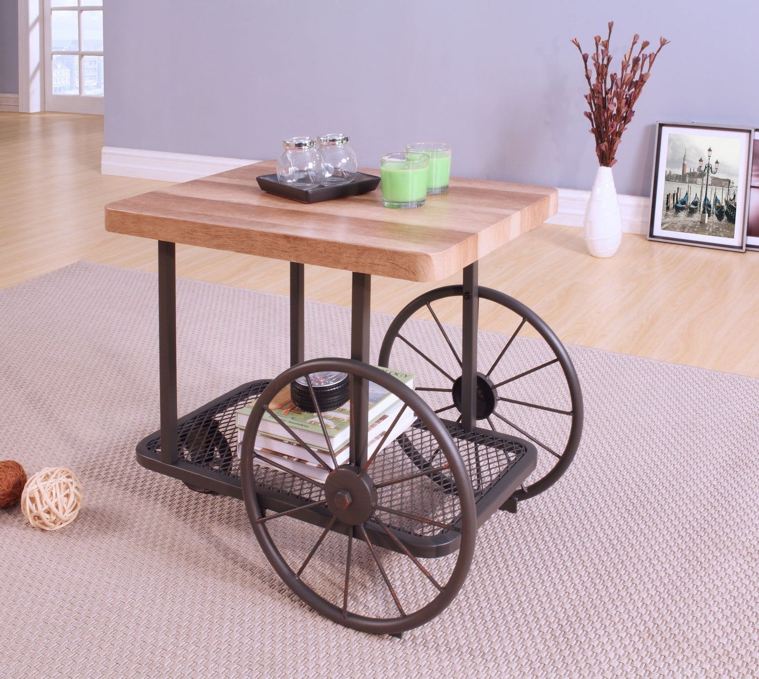 • Industrial Aesthetic: Equipped with industrial-style metal wheels in an antique sand and bronze hand-painted finish, the table adds functionality and a worn-in aesthetic.