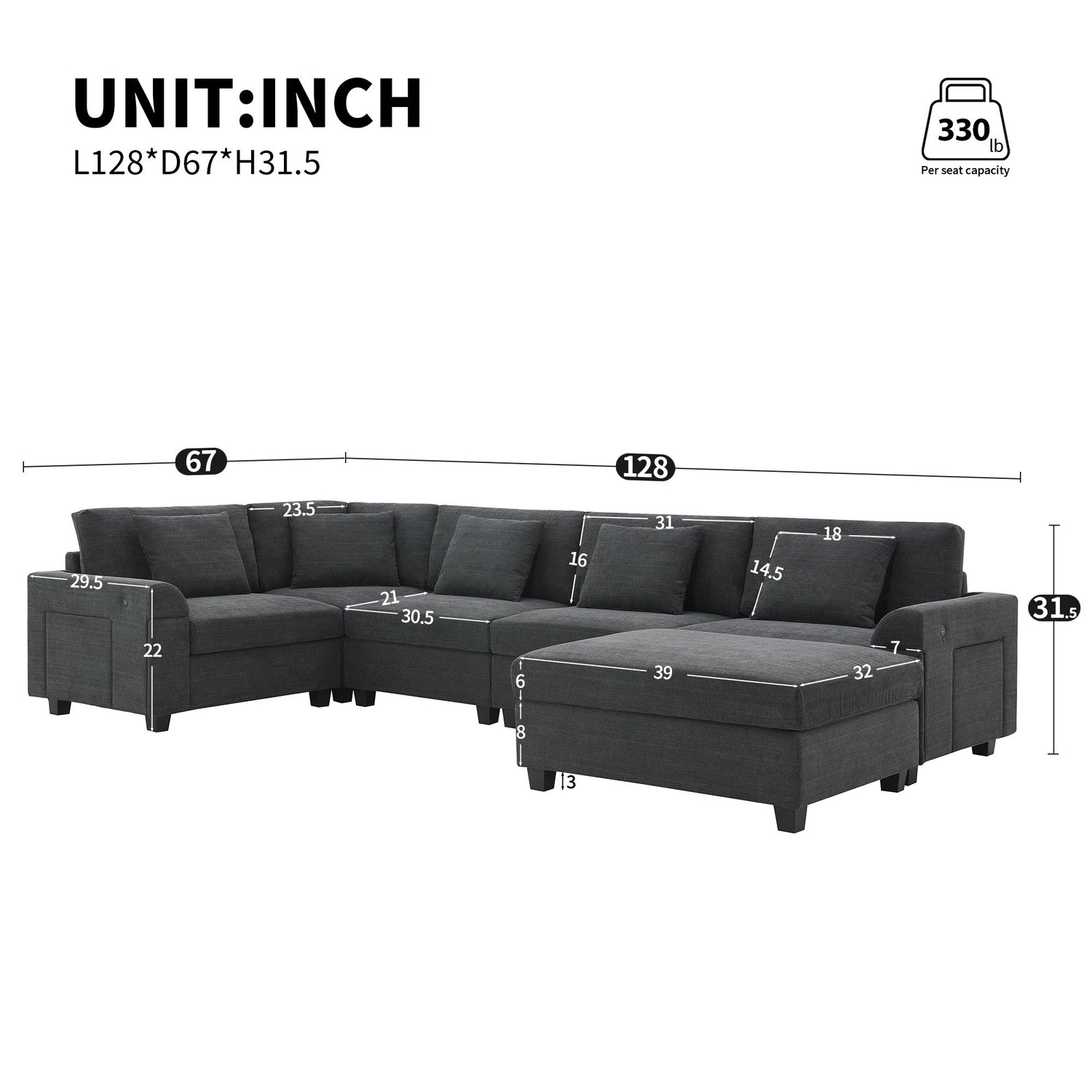 U Shaped Sectional Sofa 6 Seat Couch Set With Oversized Ottoman, Hidden Armrest Storage And Cup Holders USB Charging Ports Wide Seat Sofa