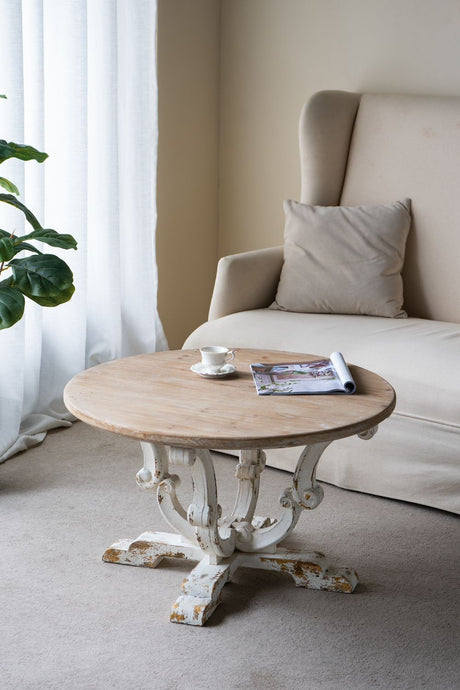 Round Wooden Coffee Table With Distressed Scrollwork Legs - Multicolor