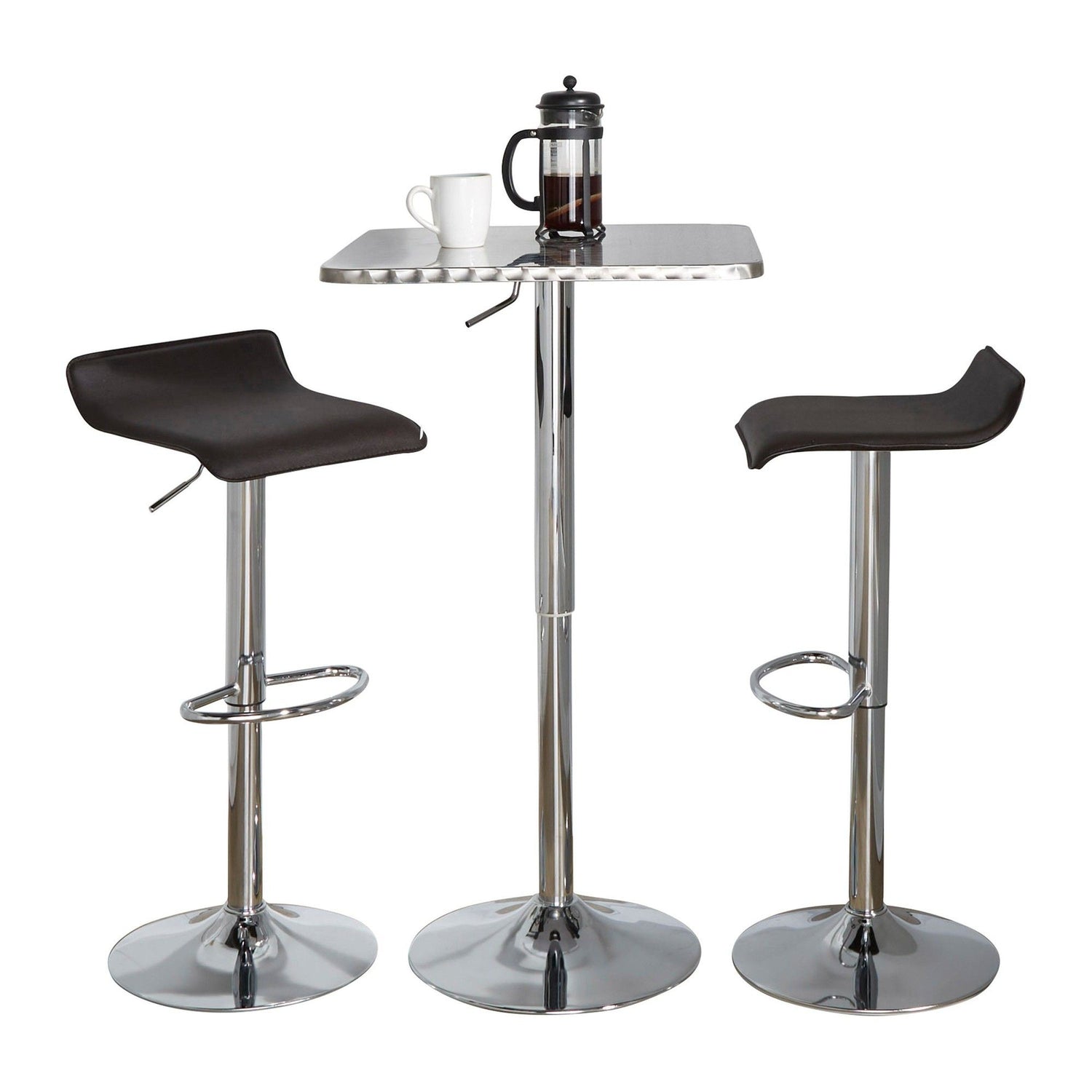 Ale - Bistro Square Contemporary Adjustable 3 Piece Bar Set - Silver And Chrome Metal With Brown PVC And Oval Footrest