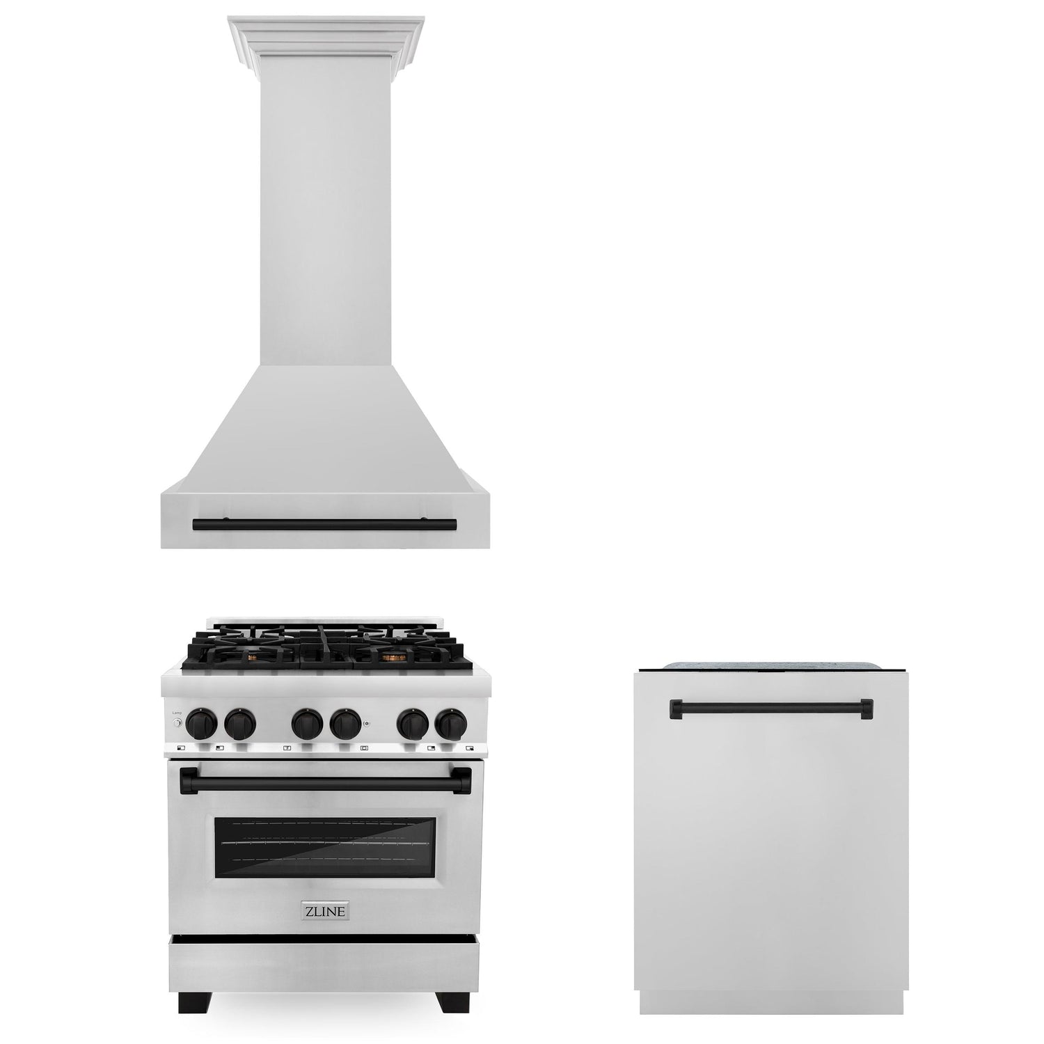 ZLINE 30" Autograph Edition Kitchen Package with Stainless Steel Dual Fuel Range, Range Hood and Dishwasher with Matte Black Accents (3AKP-RARHDWM30-MB) - (3AKPRARHDWM30MB)