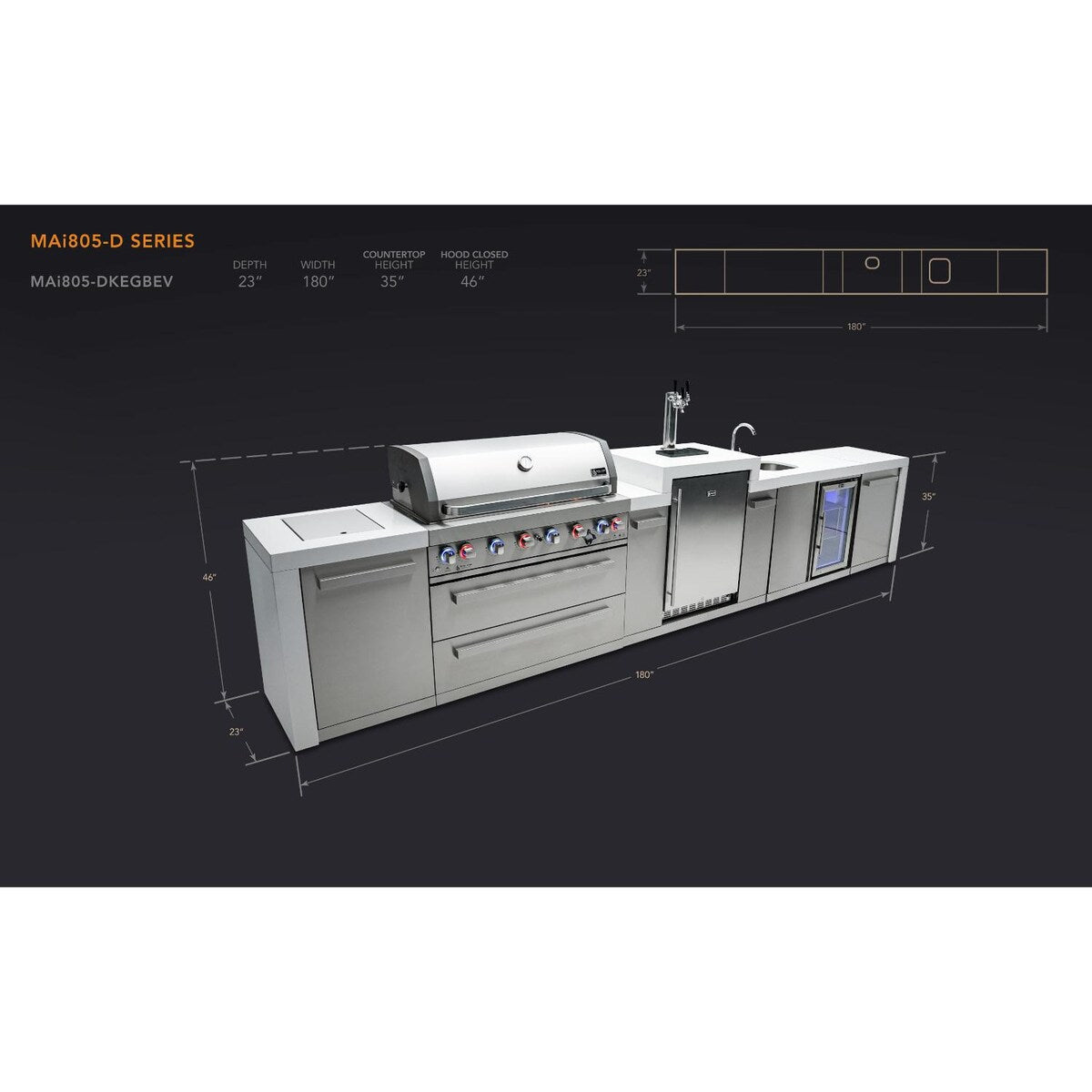 Mont Alpi Deluxe Series 15 Ft Propane Outdoor Kitchen Island w/ Side Burner, Beverage Center & Kegerator - MAi805-DKEGBEV