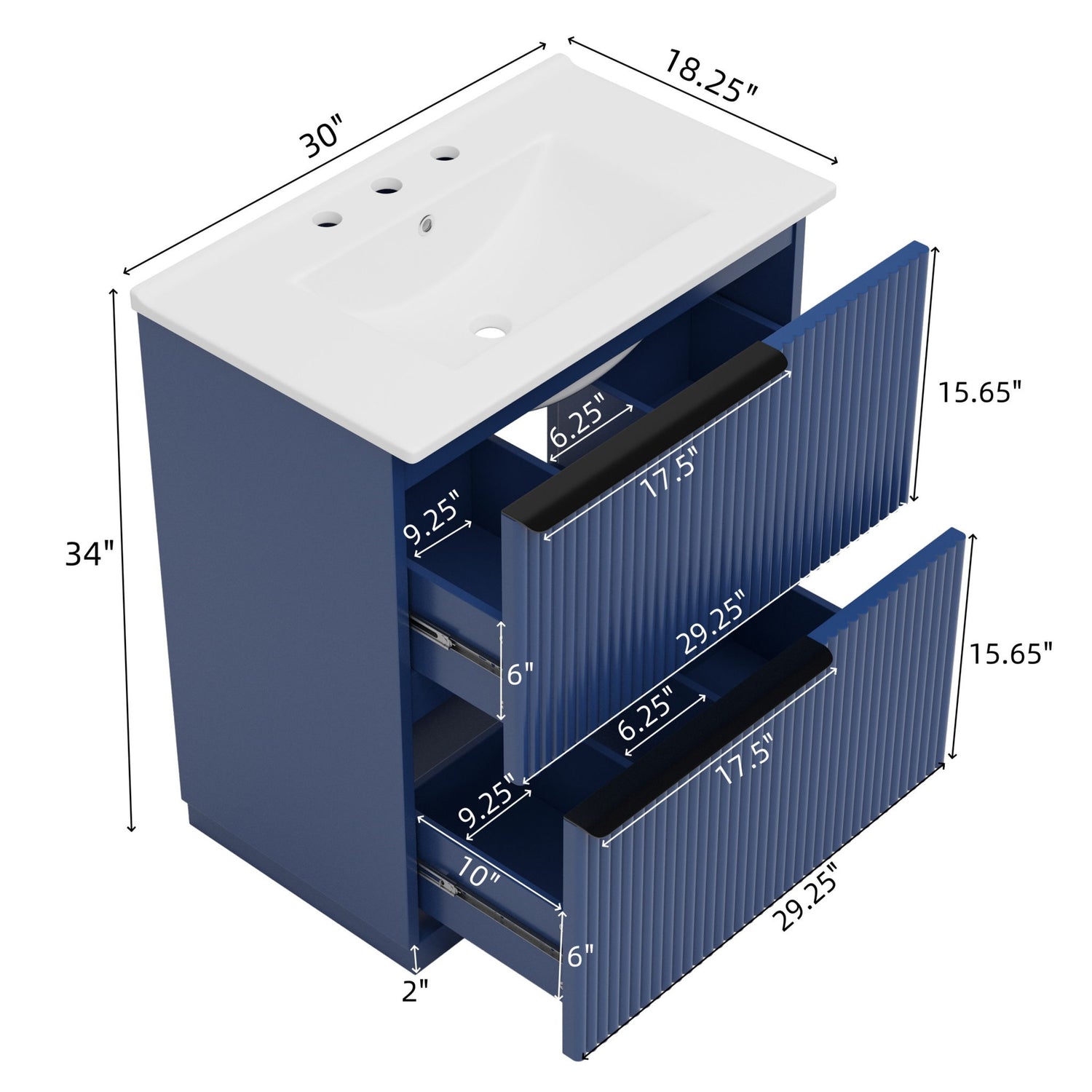 Fluted Bathroom Vanity With Sink, Full Extension Soft Close Drawers - Blue