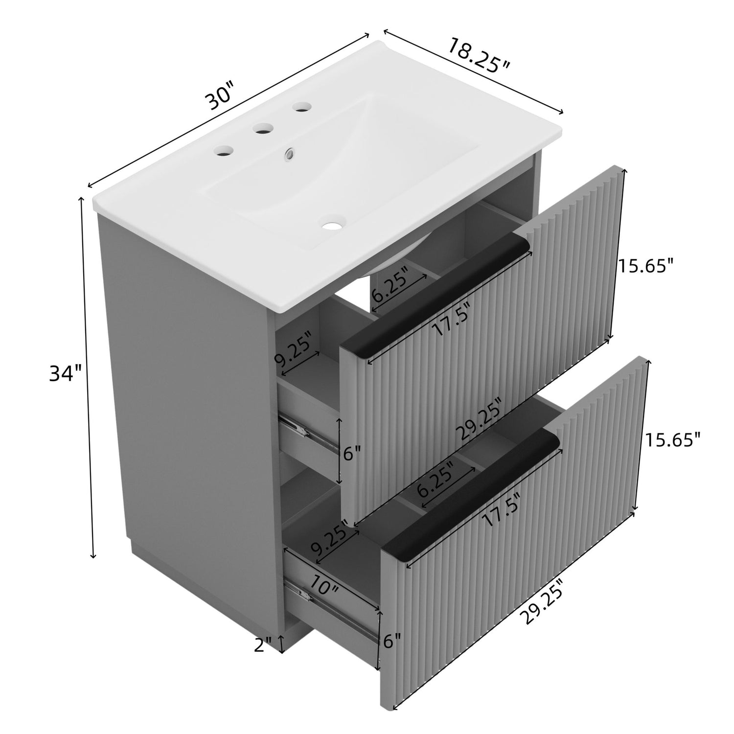 Fluted Bathroom Vanity With Sink, Full Extension Soft Close Drawers - Gray