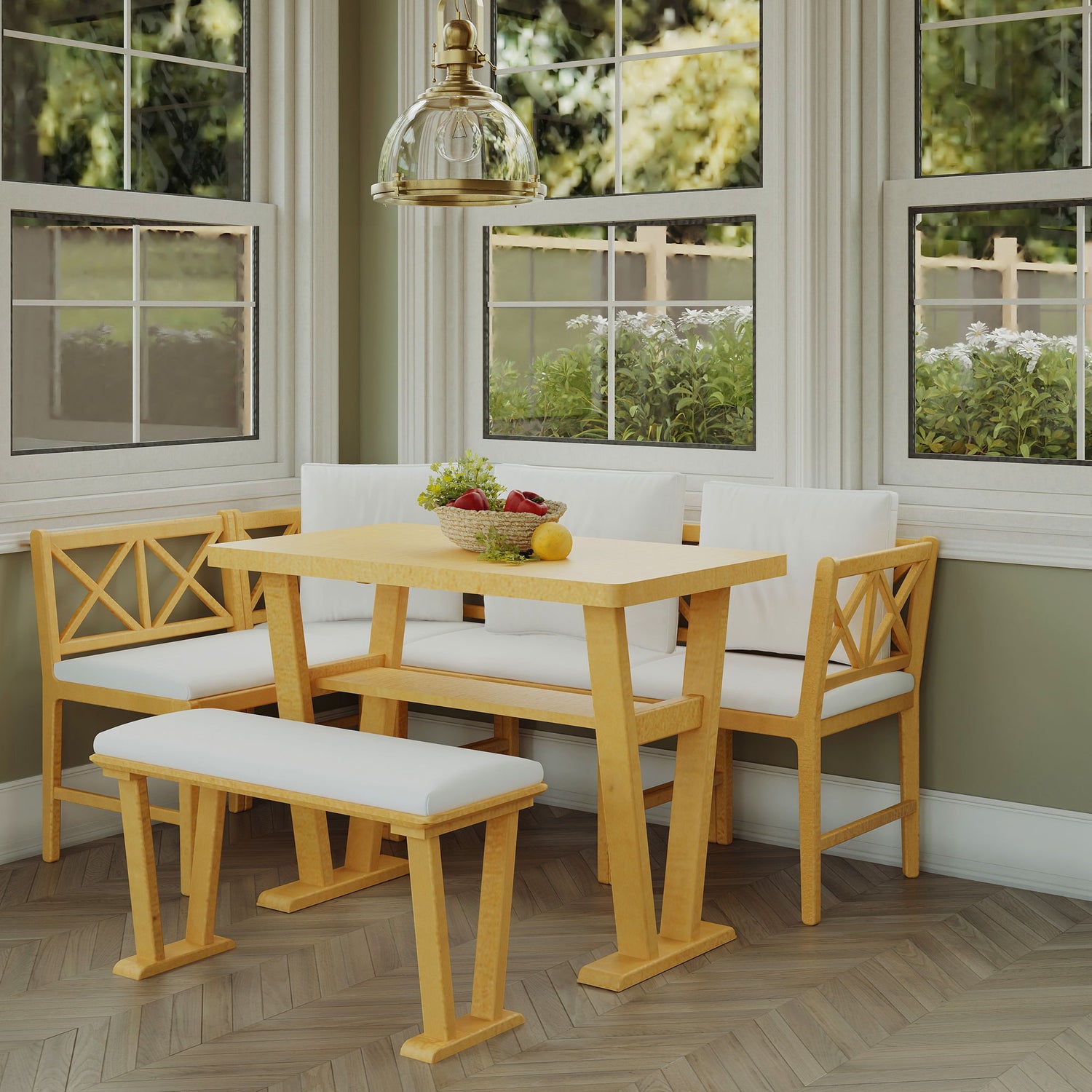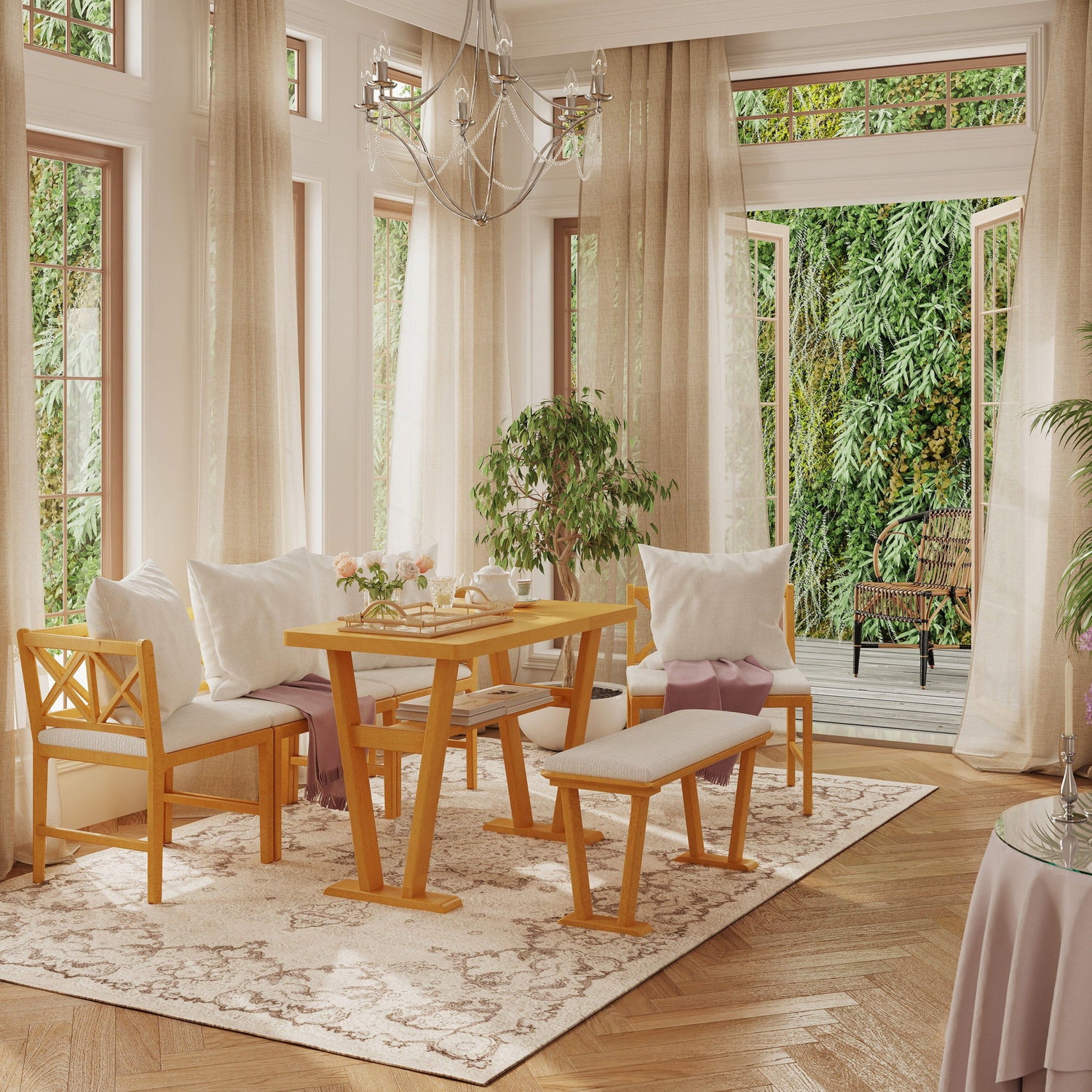 • Comfortable Seating for 4-6: Includes 2 corner armchairs, 2 standard chairs, and 1 soft padded bench for cozy dining.