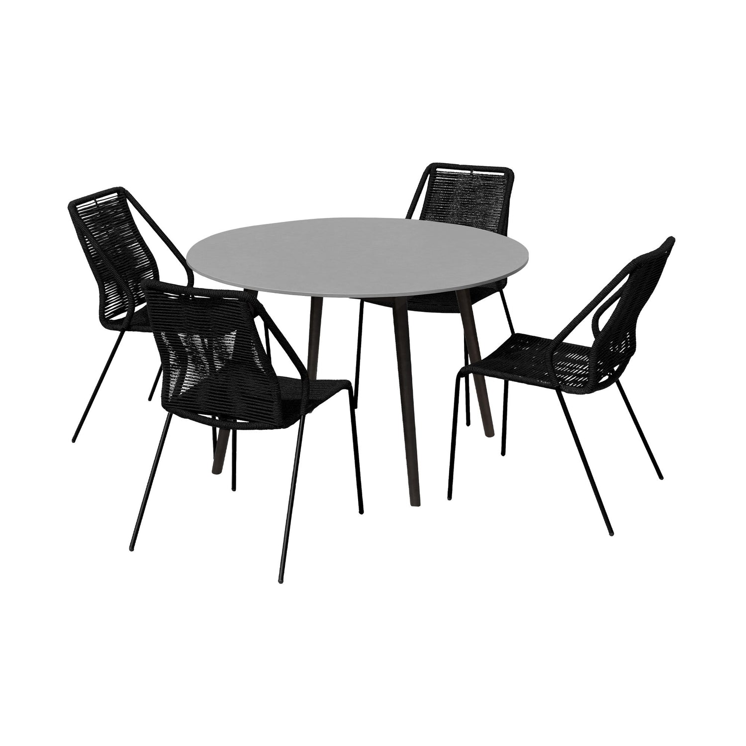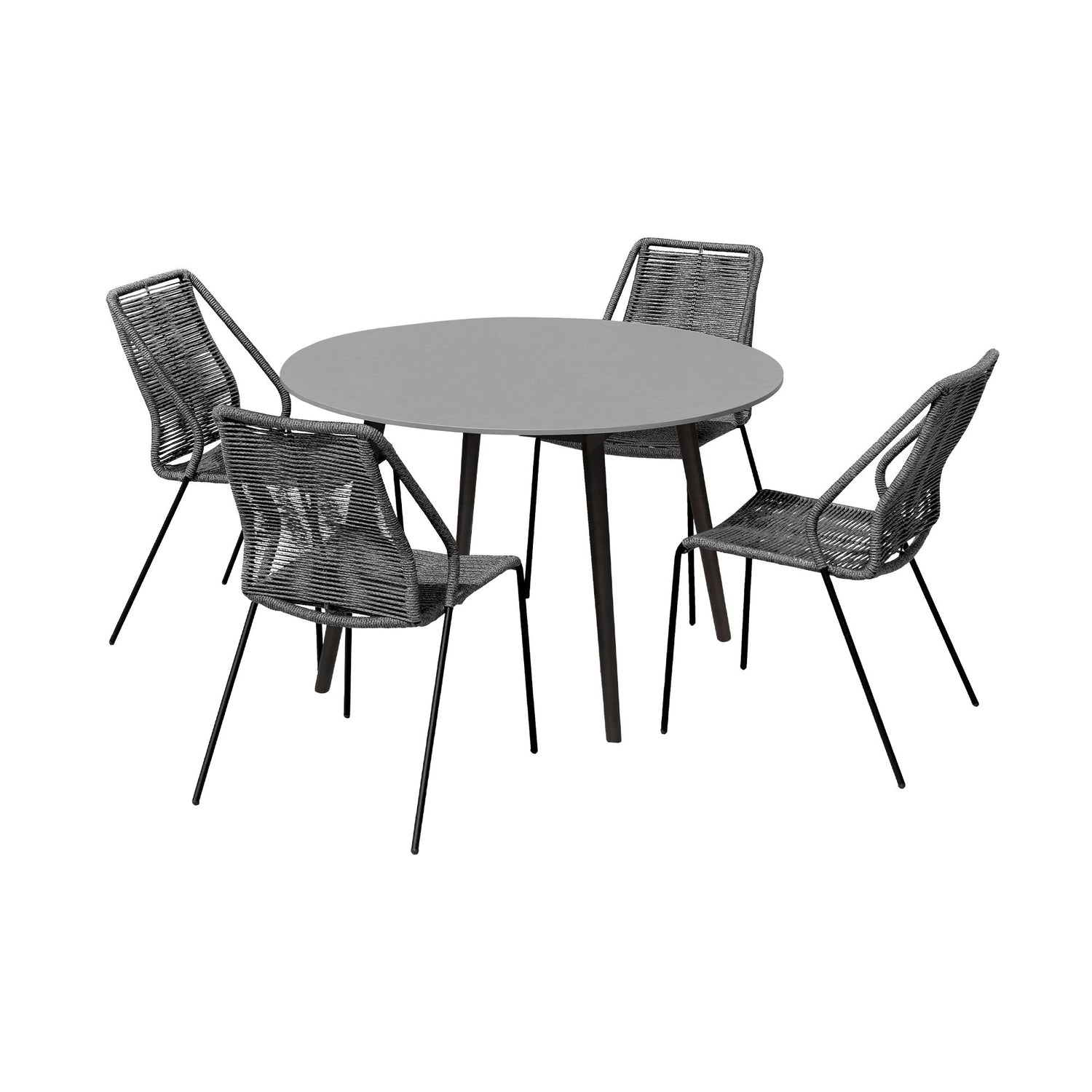 The Kylie and Clip Outdoor Patio Dining Set elevates your outdoor space with a touch of modern flair. The mixed materials work well together and create a fun and cohesive dining set for your front porch, back yard, pool side space, or patio. Constructed from eucalyptus wood and a grey super stone top, the round dining table is a modern addition that easily fits into any space. This patio dining table features sleek tapered wood legs that allow for ample leg room. One of the best reasons to choose Eucalyptus wood for your outdoor furniture or four-seasons porch is that it is exceptionally resistant to decay and rot. It naturally resists the influence of moisture because of the high oil content it naturally contains. That means it can get damp without you worrying about whether damage will occur. It can withstand several different outdoor elements while lasting for many years if it receives proper care. Defined by functional simplicity and timeless beauty, the dining table delivers a harmony of natural textures to complement any outdoor space. The stone top features a 5-layer composite with 2 layers of cement fiberboard surrounding the aluminum honeycomb core. This beautiful tabletop is durable and robust - capable of withstanding inclement weather and everyday wear and tear. The intricately woven rope featured on the durable metal frame of the Clip dining chairs form to offer you extreme comfort and relaxation. These outdoor chairs are wrapped in resilient regatta rope cording, providing supple support while still allowing for element passthrough - also enhancing your seating experience with a softness that rivals most fabrics. Each chair is made with the best craftsmanship, with these chairs standing on top of durable metal legs in a black finish for a modern look. For use indoors and out, the soft UV coated nylon cords are hand dyed resulting in subtle tonal variations.