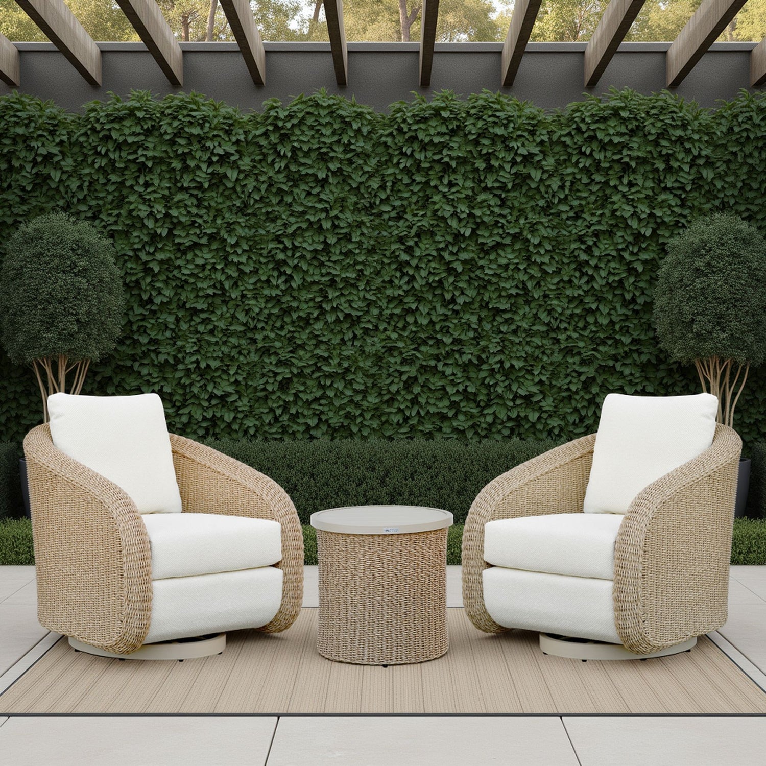 Pavilion - 3-Piece Outdoor Conversation Set (Swivel Club Chairs & End Table) - White / Natural
