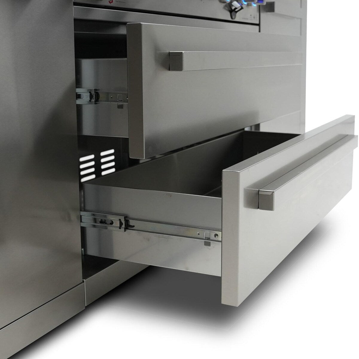 Designed for style and function, the waterfall granite countertops and side panels add a touch of sophistication while making cleanup effortless. Built from 304 stainless steel components, this grill island is weather-resistant and made to withstand the elements.
