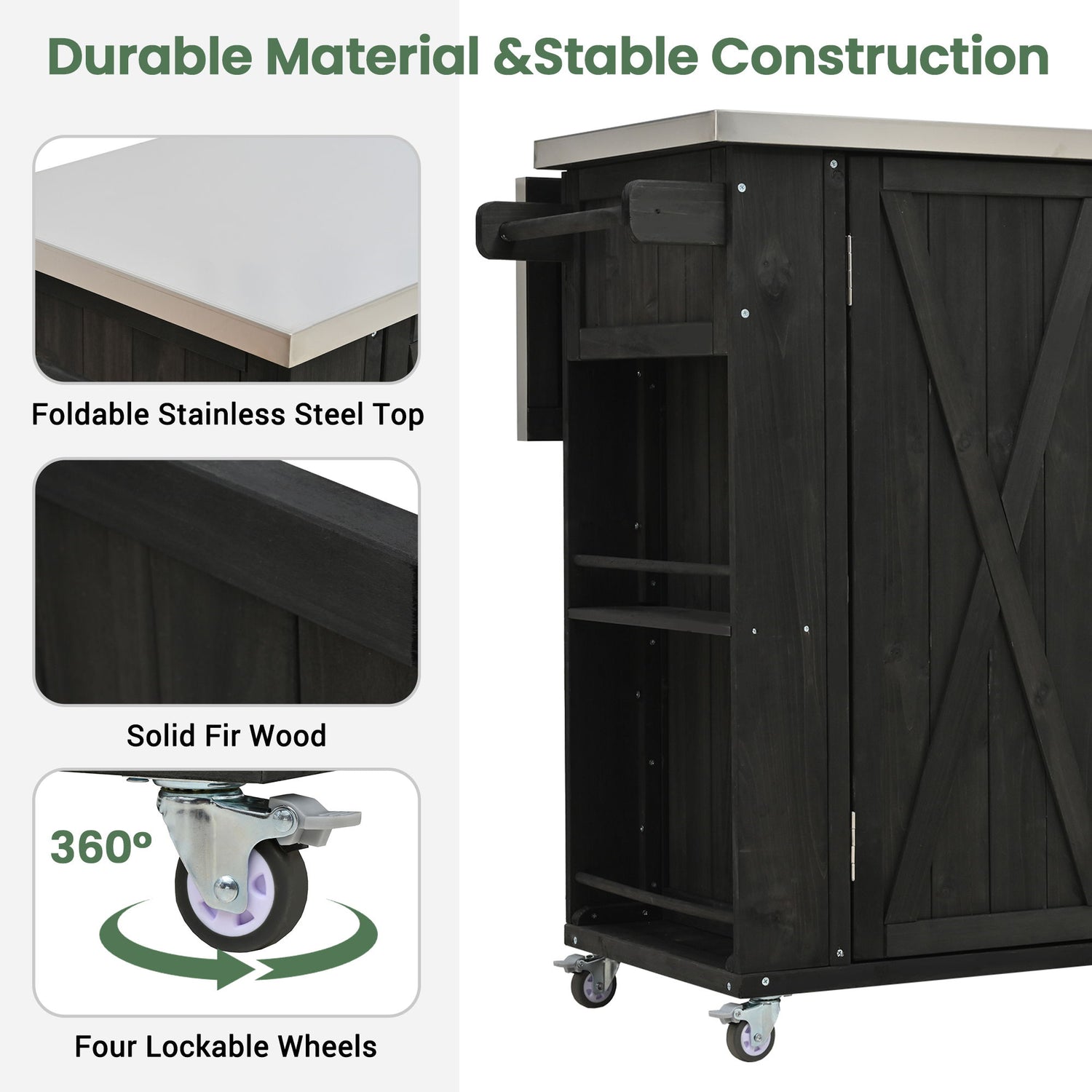 Outdoor Kitchen Island Fir Wood Kitchen Island With Stainless Steel Top, Ample Storage Space, Towel And Spice Racks And A Bottle Opener For Outdoor - Black
